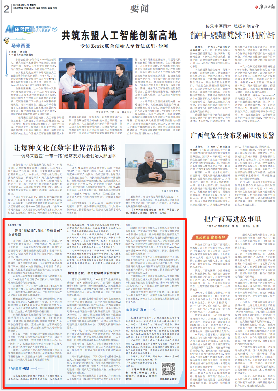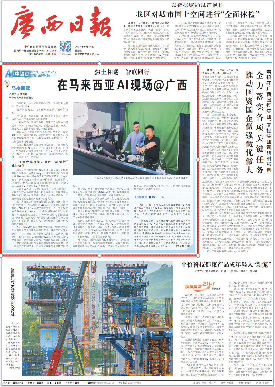 马来西亚,地处东南亚核心位置,天然辐射东盟近7亿人口市场; 电力资源充足,电价在东南亚属于相对低的水平; 政治稳定、经济开放、通用英语普及率高,具有丰富的人才资源和良好的法律环境。 这种种优势,吸引了微软、谷歌以及中国的字节跳动、华为、阿里云等巨头,纷纷深度扎根,将其打造为人工智能技术与应用的前沿探索地。 根据马来西亚数字经济机构的公开数据,截至2024年底,该国已建成运营的数据中心超过50个,总机柜数量突破20万架,年均复合增长率15%以上,人工智能需求飞速增长。 在这片科技巨头们竞相布局的热土,广西如何实现跨越国界的AI共鸣?7月31日至8月4日,广西云-广西日报AI体验官奔赴马来西亚,进企业、访专家、探民众,在中马合作的第一现场寻找到了答案——生态卡位,协同共进。 搭建合作桥梁,彰显“AI纽带”独特价值 与来自深圳的乐聚机器人互动,看大疆无人机检测作业的影像,体验以DeepSeek为基础研发的马来语大模型……走进中国—东盟人工智能实验室,“AI体验官”仿佛置身于一个中国AI技术的“微缩世界”。中国十多家人工智能领军企业如阿里云、大疆、DeepSeek等,云集于此,各展高招。 这场景或许会让人误以为实验室位于中国境内,实则它坐落在马来西亚的八打灵再也市,是该国唯一获得政府认可的人工智能实验室。值得一提的是,广西日报是首家走进该实验室的国际媒体。 这一实验室由广西北投信创科技投资集团(简称“北投信创”)与马来西亚MYEG服务有限公司联合组建。“2025年4月,马中两国签署关于人工智能发展的谅解备忘录,MYEG与北投信创敏锐把握这一机遇,牵头组建实验室。”Zetrix的创始人拿督法兹里·沙阿说,这既是马中两国深化科技合作的标志性成果,也是连接中国先进人工智能资源与东盟市场需求的关键纽带。 Zetrix是MYEG旗下的区块链平台。“实验室首个重大项目是马中国家数字身份互认,目前已进入筹备阶段。”Zetrix的另一联合创始人黄忠仁一边演示一边介绍,该项目通过AI智能体与Zetrix区块链的结合,实现两国公民在金融、旅游等领域的跨境身份无缝验证,破解此前跨境数据交换中的合规与安全难题。这一突破不仅便利民生,更为区域数字贸易搭建了信任基石。 据了解,该项目将首先在广西试点。届时,马来西亚公民可在广西使用MyDigital ID进行各类身份验证,中国公民的数字身份也将在马来西亚获得认可。 “目前,该项目虽未正式上线,但已进入与政府部门的深度对接阶段,计划于今年第三季度末至第四季度初完成与中国的互认测试。”黄忠仁表示,这意味着两国公民跨境身份核验将迎来“秒级”体验。 除了区块链,实验室还对中国的无人机、工业机器人、生成式人工智能、具身机器人等先进技术,进行本地化应用的研发。 深圳的乐聚服务机器人在马来西亚存在语言障碍,实验室对它进行了语音系统优化,让它能听懂本地语言指令。据了解,目前已有3台机器人在当地投入测试,“计划未来5年内实现软硬件自主生产,目标是让机器人走进博物馆、汽车展厅等场景,承担引导、客服等角色。”黄忠仁信心满满。 无人机在农业领域的潜力也备受青睐。“马来西亚天气和地形特殊,桥梁检测需求有限,但农业施肥、洒药场景很适合无人机。”实验室正探讨无人机进口代理模式,计划将技术本土化后推广,目前已与本地大型种植企业达成初步意向。 AI体验官·观察 中国—东盟人工智能实验室的创建和运转,无疑是“北上广研发+广西集成+东盟应用”路径的生动实践。而在这个“中企技术”丝滑迈向“本地适配”的平台,广西更是鲜明彰显了“AI纽带”的独特价值。 广西北投信创与马来西亚MYEG的强强联手并非偶然的商业合作,而是广西凭借地缘优势与对东盟市场的深刻理解,精准捕捉合作机遇的必然结果。从选址八打灵再也市的决策,到协调中国领军企业入驻的过程,广西团队始终扮演着“技术媒人”的角色——既向马来西亚合作伙伴清晰阐释中国AI技术的核心优势,也将东盟市场对技术的个性化需求准确传递给中国企业。这种双向沟通的能力,让实验室从诞生之初就成为真正连接供需两端的合作平台。 开拓“测试场”,催生“价值共创”良好局面 在中国—东盟人工智能实验室,一款融入伊斯兰文化的生成式人工智能技术让“AI体验官”大开眼界——当我们问及宗教问题时,其用马来西亚语给予了最准确最权威的回答;在进行日常交互中,语言风格非常符合东南亚伊斯兰社会的表达习惯。 “这款生成式人工智能技术以DeepSeek为基底模型,融入伊斯兰价值观、文化规范和法律条例进行训练,因此AI的回答更贴合本地语境。”黄忠仁说,实验室计划近期正式推出该产品,后续还将拓展至印度尼西亚等伊斯兰国家。 在中国—东盟跨境主播孵化基地马来西亚分中心,“AI体验官”也目睹了中国技术与马来西亚文化的深度融合与奇妙碰撞。
