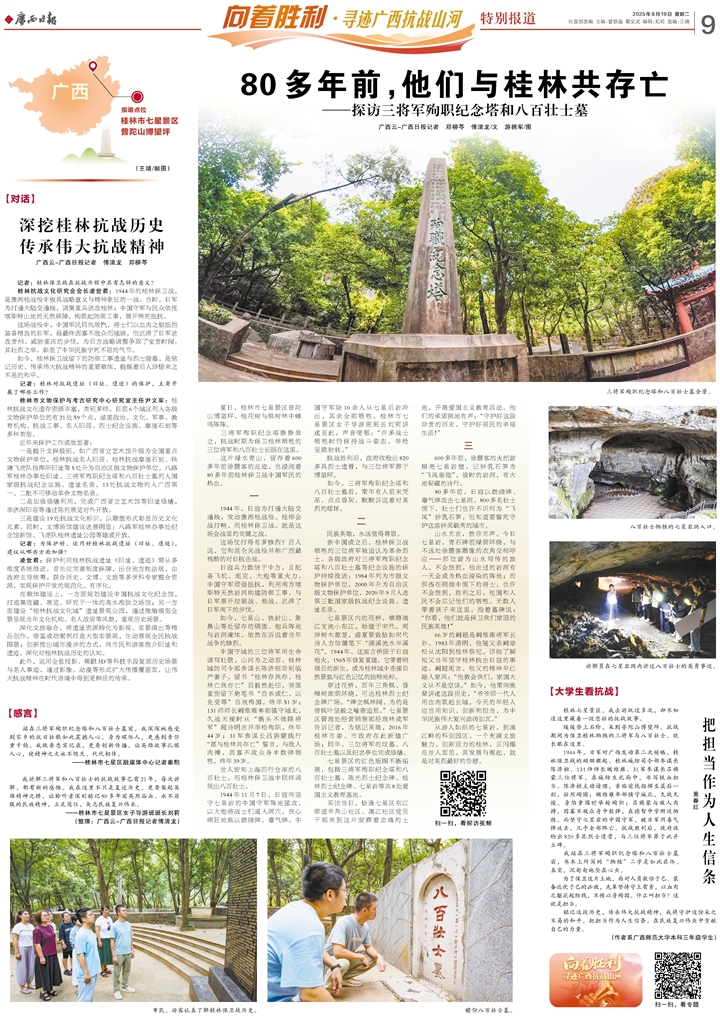 瞻仰八百壮士墓。 三 600多年前,徐霞客的火把曾照亮七星岩壁,记钟乳石笋为“飞凤垂翅”,彼时的岩洞,有大地秘藏的诗行。 80多年前,日寇以燃烧弹、毒气弹攻击七星洞,800多名壮士倒下。壮士们也许不识何为“飞凤”钟乳石笋,但知道要誓死守护这座钟灵毓秀的城市。 山水无言,然非无声。今日七星岩,青石碑前绿荫环绕,与不远处徐霞客雕像的衣角交相呼应——那位曾为山水写传的旅人,不会想到,他走过的岩洞有一天会成为热血浸染的阵地;而那些在硝烟中倒下的将士,也许不会想到,胜利之后,祖国和人民不会忘记他们的牺牲。无数人带着孩子来这里,指着墓碑说:“你看,他们就是保卫我们家园的民族英雄!” 66岁的阚超是阚维雍将军长孙。1983年清明,他随父亲阚培松从沈阳到桂林祭祀,详细了解祖父当年坚守桂林抗击日寇的事迹。阚超坦言,祖父的精神早已融入家风:“他教会我们,家国大义从不是空谈。”如今,他常向晚辈讲述这段历史,“爷爷那一代人用血肉筑起长城,今天的年轻人应当用知识、创新和担当,为中华民族伟大复兴添砖加瓦。” 从游人如织的七星岩,到漓江畔的科创园区,一个充满文旅魅力、创新活力的桂林,正闪耀在世人面前。其发展与崛起,就是对英烈最好的告慰。 【对话】 深挖桂林抗战历史 传承伟大抗战精神 记者:桂林保卫战在抗战历程中具有怎样的意义? 桂林抗战文化研究会会长凌世君:1944年的桂林保卫战,是豫湘桂战役中极具战略意义与精神象征的一战。当时,日军为打通大陆交通线,调集重兵进攻桂林;中国守军与民众依托喀斯特山地的天然屏障,构筑起防御工事,展开殊死抵抗。 这场战役中,中国军民同仇敌忾,将士们以血肉之躯抵挡装备精良的日军,虽最终因寡不敌众而城破,但迟滞了日军进攻贵州、威胁重庆的步伐,为后方战略调整争取了宝贵时间。其壮烈之举,彰显了中华民族宁死不屈的气节。 如今,桂林保卫战留下的防御工事遗址与烈士陵墓,是铭记历史、传承伟大抗战精神的重要载体,提醒着后人珍惜来之不易的和平。 记者:桂林对抗战遗址(旧址、遗迹)的保护,主要开展了哪些工作? 桂林市文物保护与考古研究中心研究室主任尹文军:桂林抗战文化遗存资源丰富,类别多样。目前6个城区列入各级文物保护单位的有21处59个点,涵盖政治、文化、军事、教育机构、抗战工事、名人旧居、烈士纪念设施、摩崖石刻等多种类型。 近年来保护工作成效显著: 一是提升文保级别,如广西省立艺术馆升级为全国重点文物保护单位,桂林抗战名人旧居、桂林抗战摩崖石刻、秧塘飞虎队指挥所旧址等5处升为自治区级文物保护单位,八路军桂林办事处旧址、三将军殉职纪念塔和八百壮士墓列入国家级抗战纪念设施、遗址名录,13处抗战文物列入广西第一、二批不可移动革命文物名录。 二是加强修缮利用,完成广西省立艺术馆等旧址修缮,李济深旧居等通过陈列展览对外开放。 三是建设19处抗战文化标识,以雕塑形式彰显历史文化元素。同时,文博场馆建设进展明显:八路军桂林办事处纪念馆新馆、飞虎队桂林遗址公园等建成开放。 记者:为保护好、运用好桂林抗战遗址(旧址、遗迹),建议从哪些方面加强? 凌世君:保护利用桂林抗战遗址(旧址、遗迹)需从多维度系统推进。首先应完善制度保障,出台地方性法规,由政府主导统筹,联合历史、文博、文旅等多学科专家整合资源,实现保护开发的规范化、有序化。 在载体建设上,一方面规划建设中国抗战文化纪念馆,打造集收藏、展览、研究于一体的高水准独立场馆;另一方面建设“桂林抗战文化城”遗址景观公园,通过微缩模型全景呈现当年文化机构、名人故居等风貌,重现历史场景。 深化文旅融合,将遗址资源转化为影视、实景演出等精品创作,借鉴成功案例打造大型实景剧,生动展现全民抗战图景;创新推出城市漫步的方式,向市民和游客推介旧址和遗迹,深化对桂林抗战历史的认知。 此外,运用全息投影、裸眼3D等科技手段复原历史场景与名人事迹,通过影像、动漫等形式扩大传播覆盖面,让伟大抗战精神在时代语境中得到更鲜活的传承。 【大学生看抗战】 广西师范大学本科三年级学生黄春红: 把担当作为人生信条 桂林七星景区,我去游玩过多次,却不知道这里藏着一段悲壮的抗战故事。 缓缓登上石阶,来到普陀山博望坪。抗战期间为保卫桂林牺牲的三将军与八百壮士,就长眠在这里。 1944年,日军对广西发动第二次侵略,桂林保卫战的硝烟骤起。桂林城防司令部参谋长陈济桓、131师师长阚维雍、31军参谋长吕旃蒙三位将军,在城防生死局中,书写铁血担当。陈济桓主动请缨,亲临前线指挥至最后一刻,壮烈殉国;阚维雍率部镇守城北,久战无援、身陷重围时举枪殉职;吕旃蒙与敌人肉搏,因寡不敌众身中数弹,在德智中学附近牺牲。而坚守七星岩的中国守军,被日军用毒气弹攻击,几乎全部阵亡。抗战胜利后,政府收殓出820多具烈士遗骨,与三位将军葬于此并立碑。 我站在三将军殉职纪念塔和八百壮士墓前,书本上所写的“牺牲”二字是如此具体、真实,沉甸甸地坠在心头。 为了保卫这片土地,面对人员数倍于己、装备远优于己的凶敌,先辈坚持守土有责,以血肉之躯筑起防线,不惜以身殉国。什么叫担当?这就是担当。 铭记这段历史,传承伟大抗战精神,我将守护这份来之不易的和平,把担当作为人生