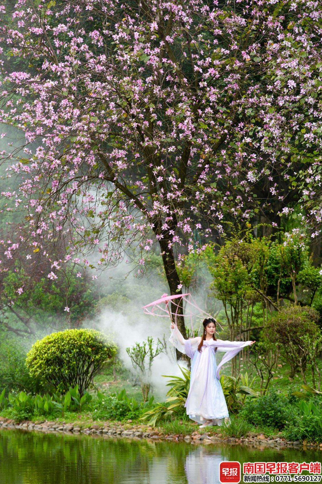 穿着古装的女子在柳州市市民广场的水边,与紫荆花合影。广西云-南国早报记者 邹财麟 摄 但要实现高质量发展,仍需破解“流量昙花一现”的难题。广西的答案是以市场为主体、政策为引导、文化为内核,构建“选题-拍摄-传播-转化”全产业链,推动景区从“借剧引流”走向“因剧升级”。 可见,“影视+文旅”绝非简单叠加,而是生态重组。当山水成为剧本、文化成为主线、流量变为“留量”,广西正以影视为媒、产业为基,走出一条具有地域特色的文旅高质量发展新路。这不仅是一次产业创新,更是一场关于“如何讲述地方”的时代试验。(桂声平)