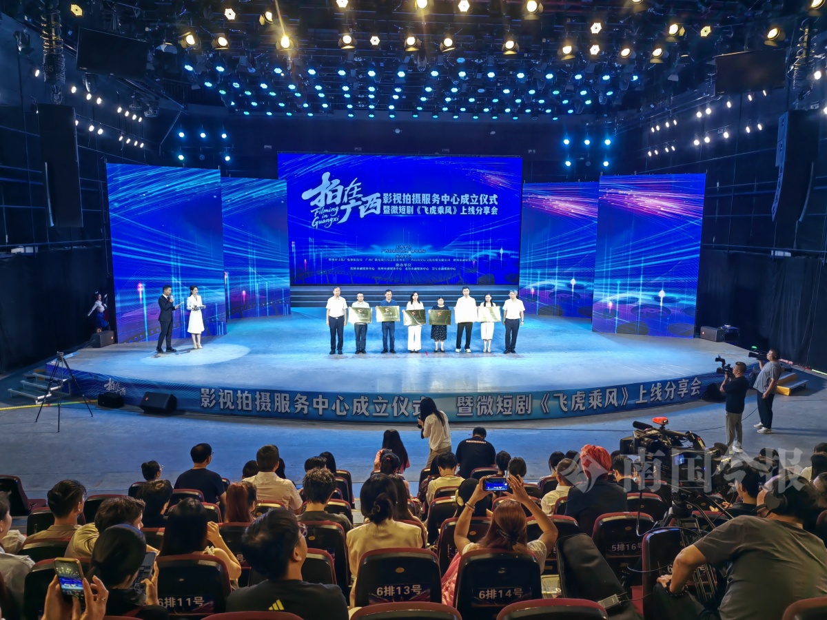 现场授牌。记者廖艳明 摄 自治区广电局副局长陆正宁表示,“拍在广西”影视拍摄服务中心的正式成立,是广西构建高水平影视拍摄服务体系的关键一步,旨在面向全国及东盟地区提供专业化、一站式全流程服务。今年5月,自治区广电局联合自治区文旅厅出台《“微短剧+文旅”融合发展专项行动方案》,以“三个一”措施为抓手,打造“秀甲天下, 拍在广西”影视拍摄服务体系,即开启一个融合传播平台(出版一本《秀甲天下 拍在广西——影视拍摄服务指南》等),搭建一个线上服务平台(建设官方网站、小程序和素材库),启动一个线下服务体系(成立广西视听产业发展协会“拍在广西”专委会)。今年以来,微短剧《飞虎乘风》《夜玲珑》、网络剧《龙骨焚箱》、电视剧《蝉》等剧组纷纷到广西取景拍摄,“拍在广西”引流效应开始显现。