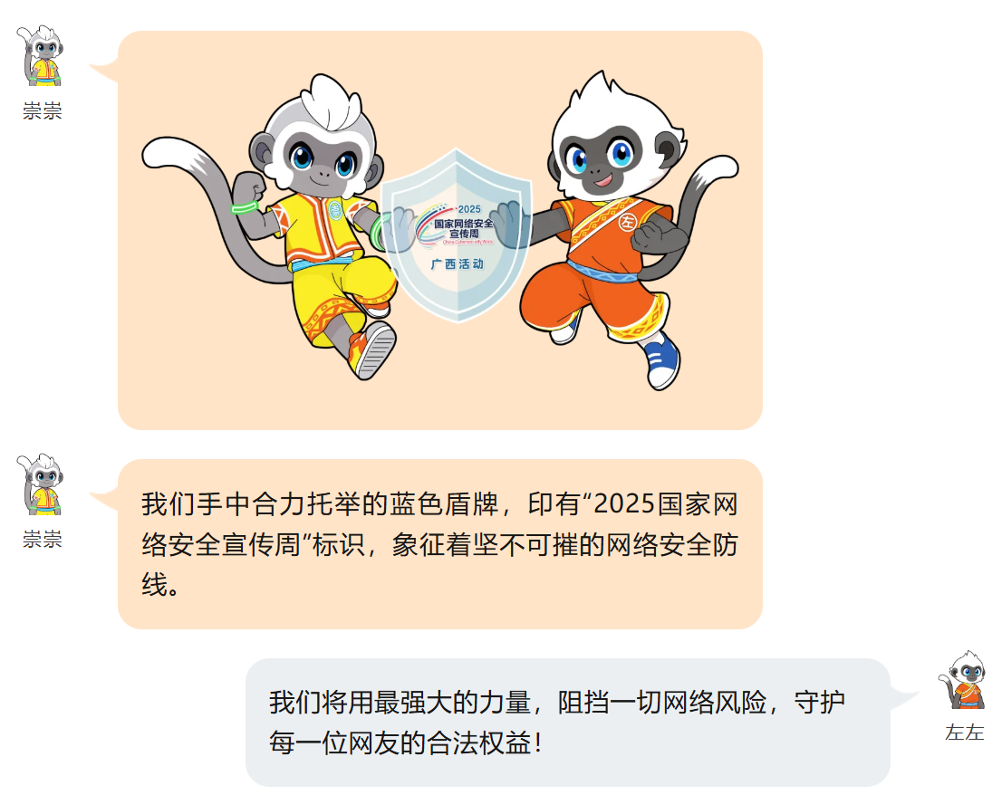 2025年国家网络安全宣传周广西活动 将于9月15日至21日在全区范围举办 启动仪式等重要活动在崇左举行 现在 给大家介绍两位网络安全小卫士—— “崇崇”和“左左” 它们是来自祖国南疆的网络安全守护组合 是2025国家网络安全宣传周广西活动IP