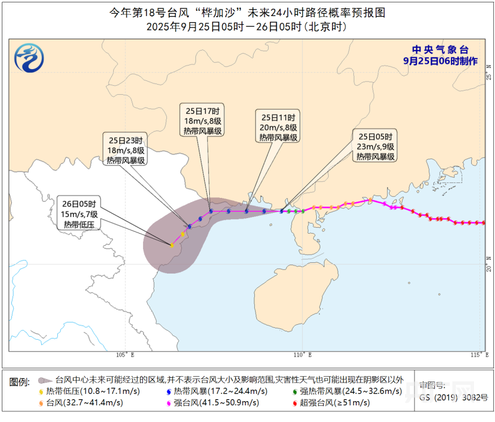 “桦加沙”未来路径概率预报图。来源:中央气象台 预计“桦加沙”将以每小时15至20公里的速度继续向偏西方向移动,趋向越南北部沿海,将于25日下午到傍晚在越南北部沿海登陆,尔后转向西南方向移动,强度逐渐减弱。 气象部门提醒,尽管“桦加沙”强度减弱,但仍将带来显著风雨影响。25日8时至26日8时,南海北部、北部湾、广东沿海及西南部地区、珠江口区、广西沿海将有6至7级、阵风8至9级的大风,台风中心经过的附近海域或地区风力可达8级、阵风9至10级。 降水方面,25日8时至26日8时,广西中南部、云南东南部、贵州南部、广东西部和北部、海南岛东部等地部分地区有大到暴雨,其中广西西南部、云南东南部等地部分地区有大暴雨(100至200毫米)。 |