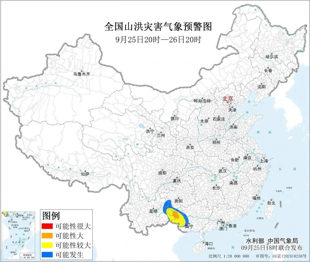 水利部和中国气象局于今天(25日)18时联合发布橙色山洪灾害气象预警。预计,9月25日20时至9月26日20时: