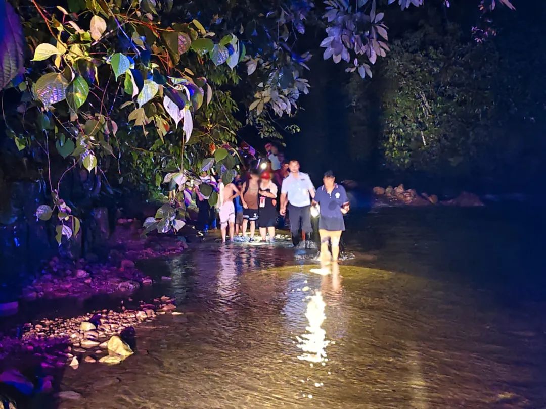 8月5日下午,桂平市紫荆派出所接到紧急求救,称在辖区木山村十八河附近,10名游客(含数名儿童)因河水突然暴涨,被困于山坑之中。彼时水流湍急,水位还在持续快速上涨,被困人员处境万分危急,随时有被冲走的危险。