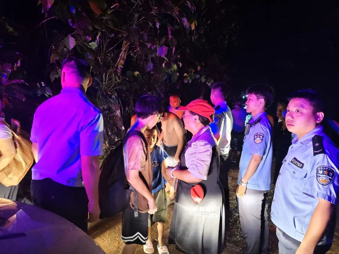 接警后,紫荆派出所民辅警火速携带专业救援装备赶赴现场。救援人员到达后发现,事发山坑水流异常湍急且水位颇深,被困游客在激流中寸步难行,险象环生,救援刻不容缓。 面对严峻形势,现场指挥人员立即协调联动赶到的镇政府工作人员,科学制定救援方案,将力量分为两组展开行动。第一组由水性良好、经验丰富的民警和辅警组成。 他们身系安全绳,在汹涌的河水中 艰难涉水前进,冒着巨大风险,以身体为屏障构筑起一条稳固的“生命通道” ,采取接力传递的方式,将被困游客逐一护送至相对安全区域。第二组人员则在岸边紧张接应、稳固绳索,并不停安抚受困游客情绪,特别是照顾好随行的儿童。 湍急的河水不断冲击着救援人员,每一次转移都充满挑战。 救援人员与时间赛跑,与激流搏斗,历经五个多小时惊心动魄的持续奋战。至当晚9时许,在公安民警、辅警与地方政府人员的 通力协作、不懈努力下, 所有10名被困游客(含儿童)均被成功营救上岸,无一人伤亡。 此次成功救援,是贵港公安民警危急时刻冲锋在前、践行“人民至上、生命至上”理念的生动体现,也展现了基层应急力量的快速反应能力和高效协作水平,赢得了群众的高度赞誉。 危急时刻!大树砸倒老人,民警疾驰救援
