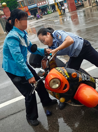 辅警马艳萍帮助一名骑车摔倒的群众扶起电动车
