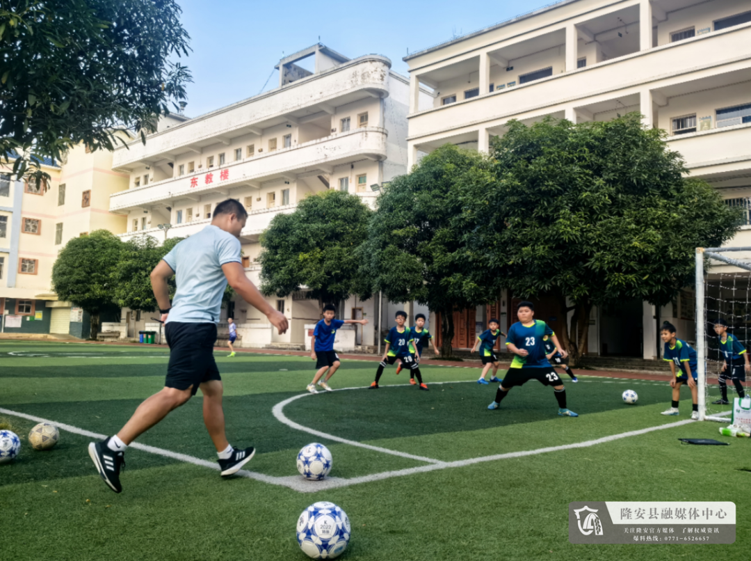 曾裕文把游戏和体育结合起来,让孩子“学中玩、玩中练”。黄熙 摄 同年10月,曾裕文突然接到一项紧急的比赛任务,一小要组织学生参加中小学生足球联赛,而准备时间仅剩一周多。他临危受命,勇挑重担,在本校老师的协助下,迅速召集起一批有足球基础的孩子,在一周时间内完成了队员选拔与集训。最终,曾裕文带领球队斩获隆安县小学足球比赛男子组亚军。