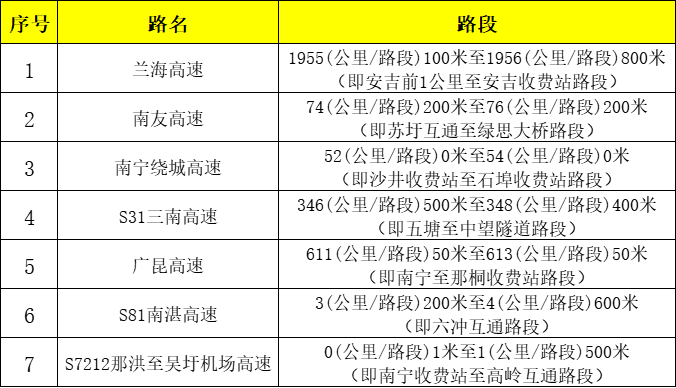 △近3年国庆假期期间南宁市事故多发路段 经过对近3年国庆假期全市道路交通事故情况进行分析,南宁交警梳理出7个道路交通事故多发的路段,请各位驾驶员途经上述路段时专注驾驶、谨慎慢行。 广大驾驶人和节日出行群众,需要注意这些事项——