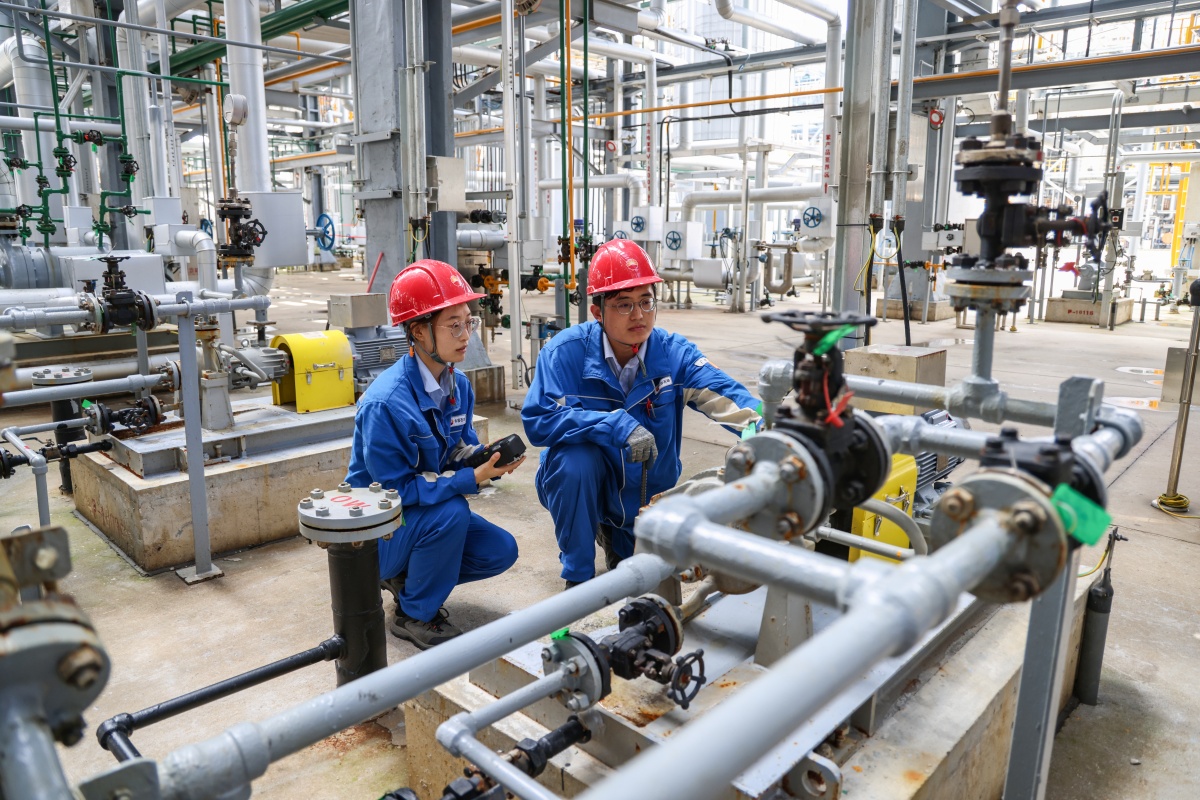 广西石化化工一部操作员在己烯-1装置现场检查机泵运行情况。
