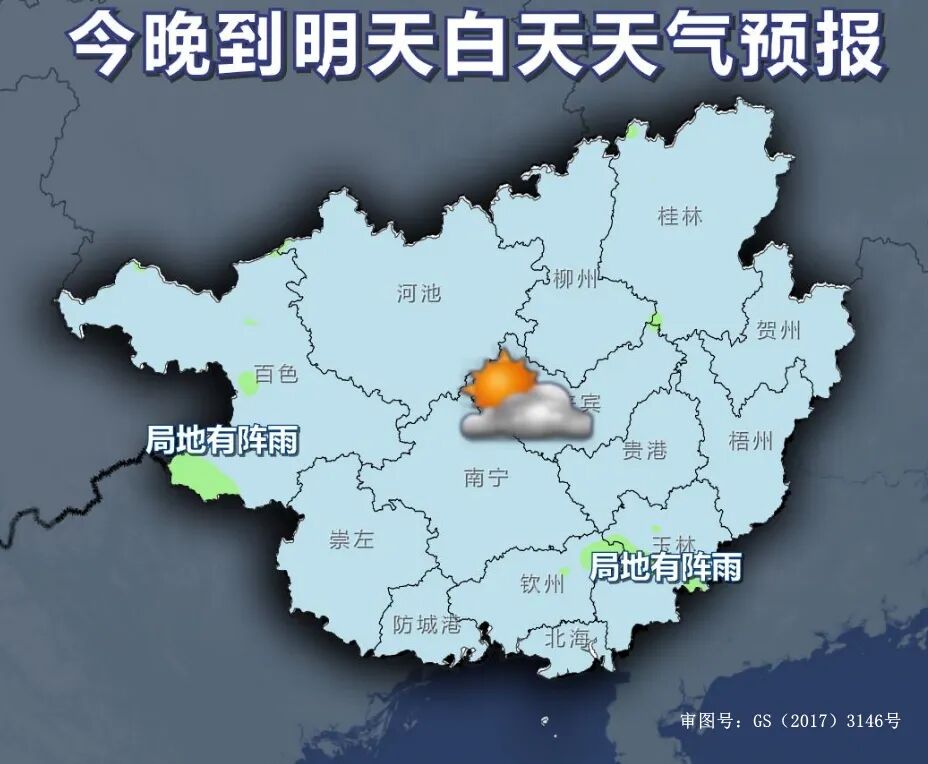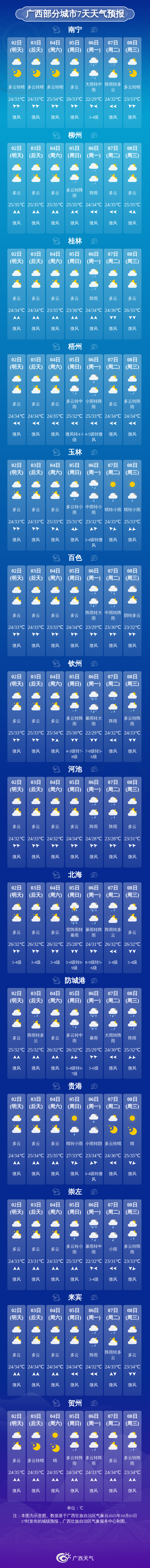 今天晚上到明天白天,全区多云,其中百色、玉林等市局地有阵雨。 南宁市:今天晚上到明天白天,多云间晴,偏南风1~2级,最低气温24℃,最高气温33℃。 森林火险气象等级:全区3级,较高火险。