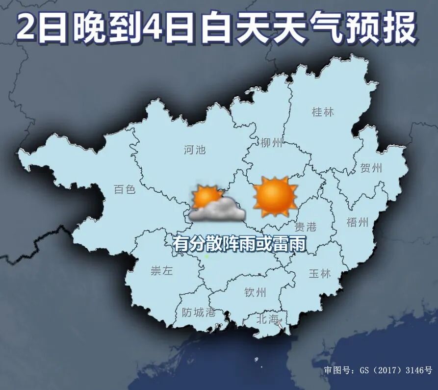 这个国庆中秋假期广西天气是这样安排的: 预计,未来三天 广西大部以晴到多云为主 大部最高气温31~36℃ 外出游玩的朋友们 多补水,带好遮阳伞 不然晒黑中暑可能会找上门哦 天气转折来了! 5-6日,受热带系统影响 北部湾海面、桂南、桂西有较强风雨天气 目前热带系统的强度和路径还有不确定性 气象部门将持续关注其发展 及时发布最新预报信息 未来三天天气预报 广西气象台1日17时发布预报: 陆地天气预报
