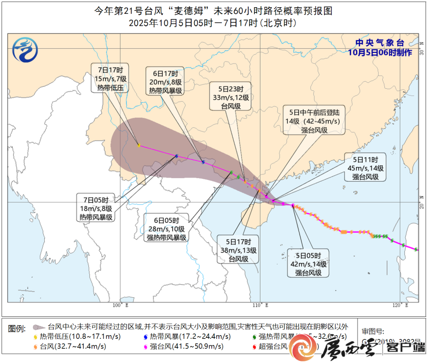 台风“麦德姆”活动路径。 受其影响,5日白天到6日白天,北部湾海面平均风9~11级、阵风12~13级,台风中心经过的附近海域风力有12~13级、阵风14~15级,沿海地区平均风8~10级、阵风11~12级,桂南平均风6~8级、阵风9~10级,桂西平均风5~6级、阵风7~9级;桂南和桂西有大雨到暴雨、局地大暴雨,北部湾海面有暴雨到大暴雨、局地特大暴雨。 出行方面,预计10月6日(中秋节)中午至晚间出现赏月出行高峰、10月8日下午至晚间将出现返程高峰。 台风来袭,广西公安机关发布国庆中秋暴雨天气驾车安全指南,提醒广大群众小心驾驶、平安过节。