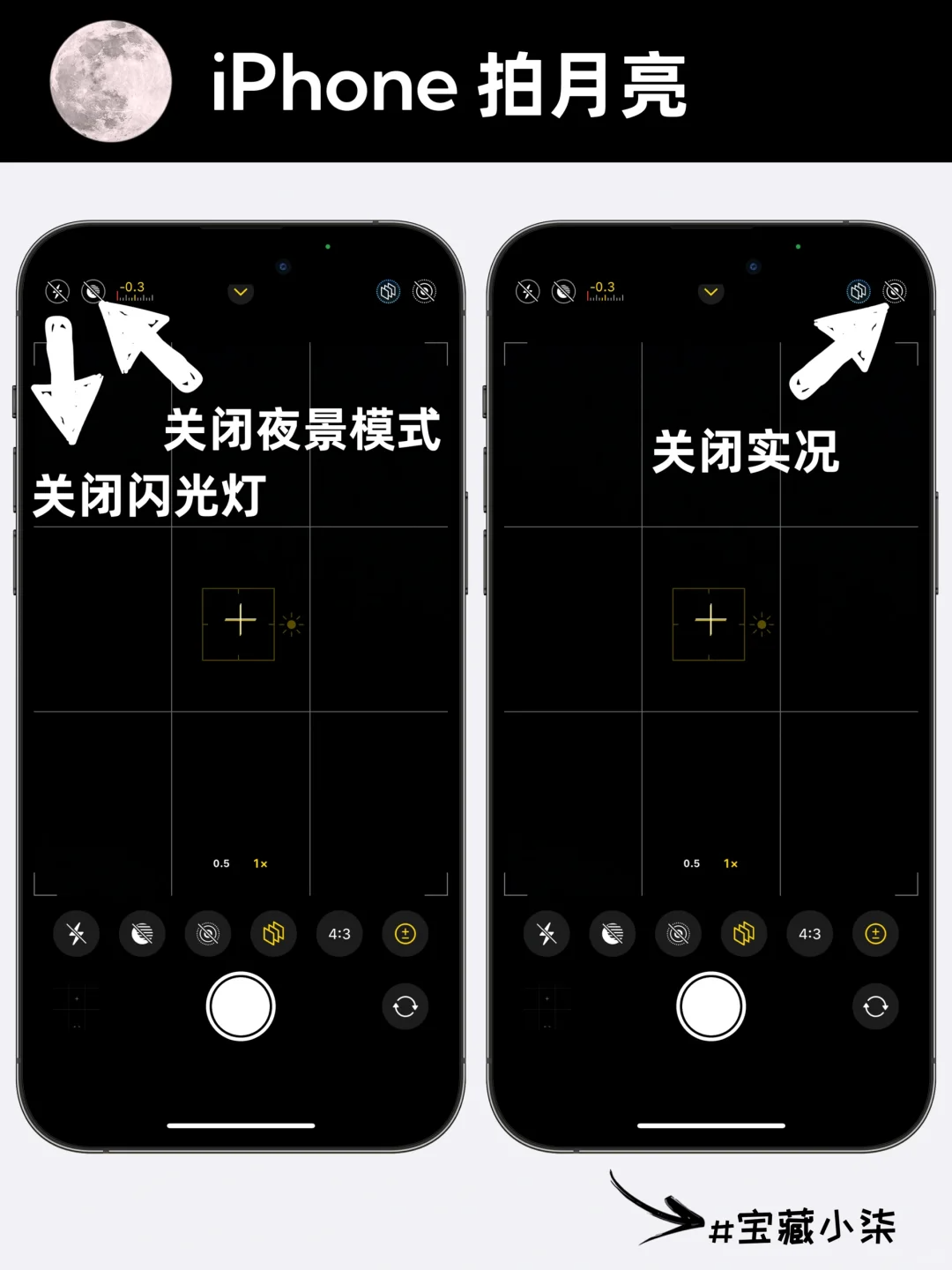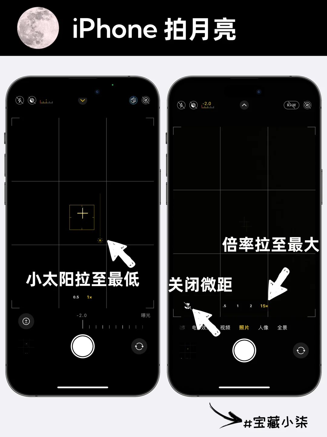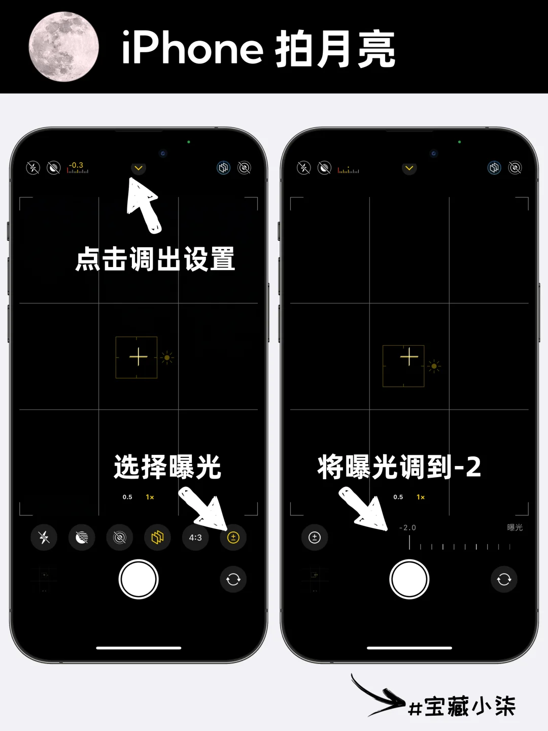 1关闭闪光灯、夜景模式、实况 2点击屏幕顶部中间的箭头,调出设置选项,找到曝光按钮,拉到-2 3倍率拉到最大,然后对着月亮狂点屏幕 4对焦成功后,将小太阳拉低 学会了吗? |