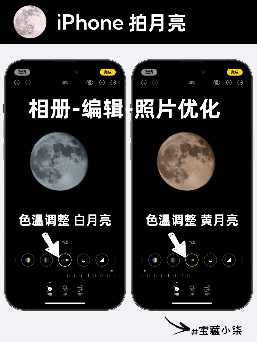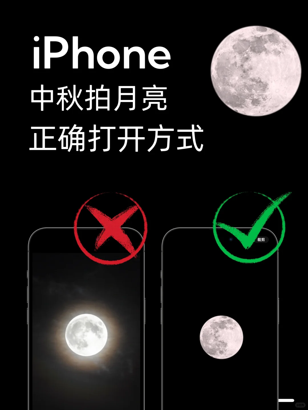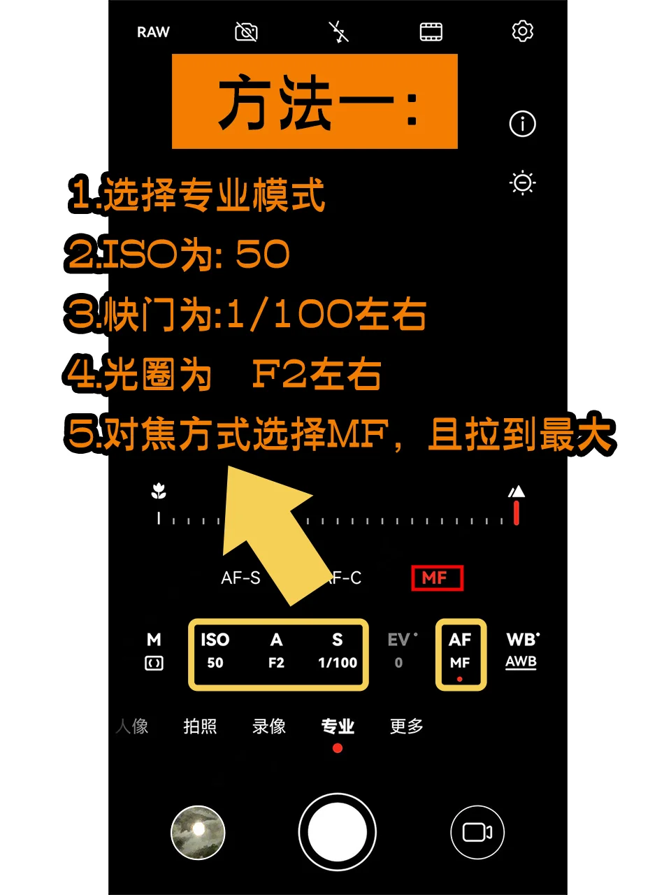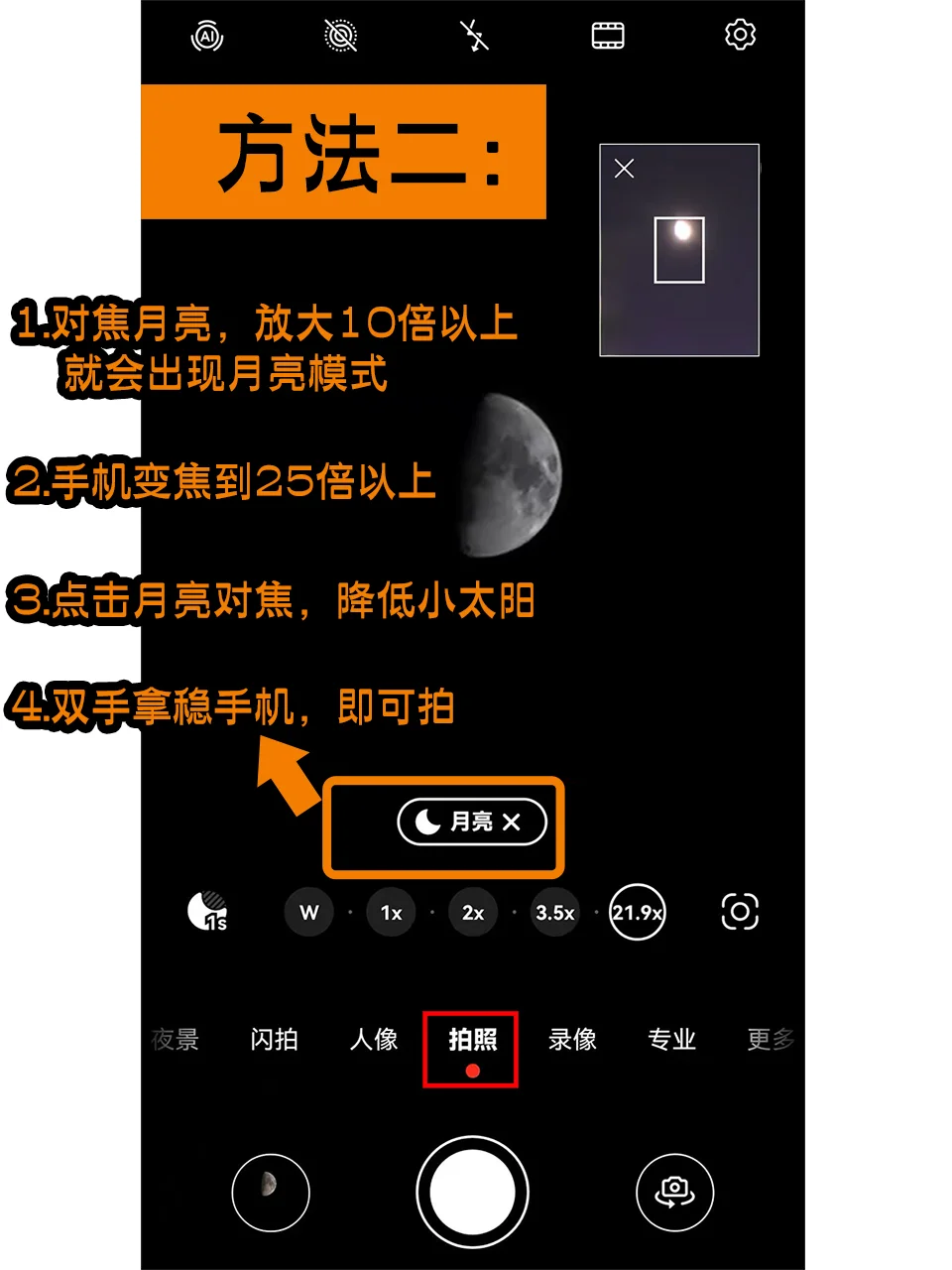 方法一: 1选择专业模式 2ISO为:50 3快门为:1/100左右 4光圈为:F2左右 5对焦方式选择MF,且拉到最大 方法二: 1对焦月亮,放大10倍以上,就会出现月亮模式 2手机变焦到25倍以上 3点击月亮对焦,降低小太阳 4双手拿稳手机,即可拍 iPhone手机拍月亮