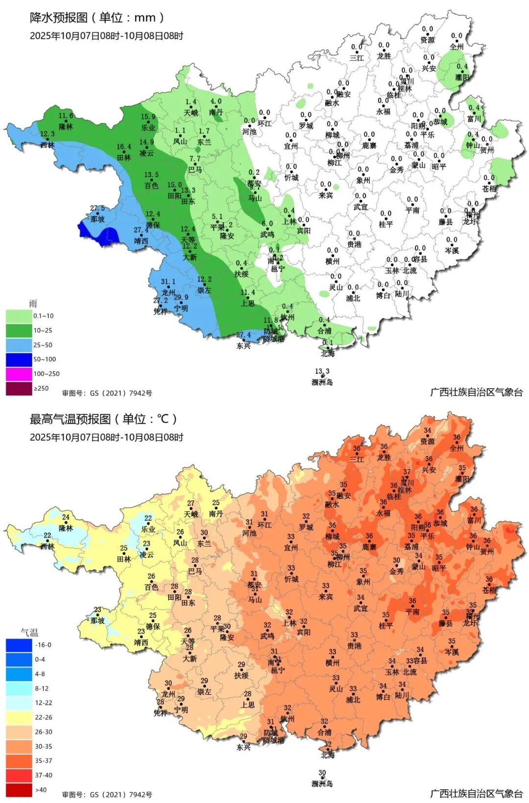 全国强降雨预报图(10月7日08时—8日08时) 假期返程全区大部多云为主 气温逐渐回升 外出或返程的朋友 需关注最新天气预报预警信息 做好防范应对措施 一起来看具体天气预报↓↓ 具体天气预报 预计,7日晚上,百色、崇左、防城港等市有阵雨或雷雨,其他地区多云有分散阵雨。