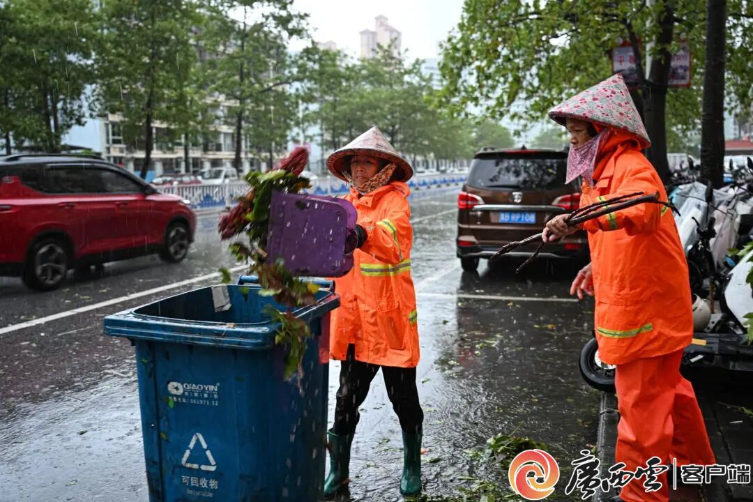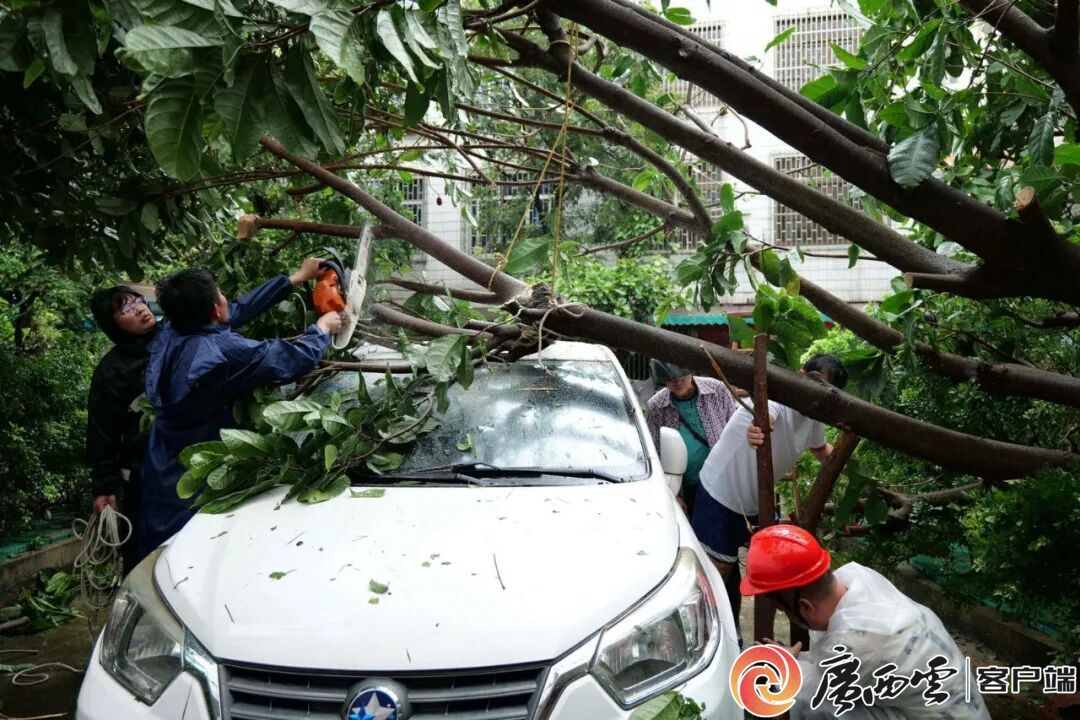 绿化工人在茶亭路清理倒伏树木。韩丹 摄 台风过境,残枝断木清理任务艰巨。“我们组织环卫工人迅速响应,及时对主次干道、商业街区及背街小巷内的断枝、落叶、生活垃圾及积水点漂浮物进行全面清理。”北海市环卫处有关负责人介绍,截至6日12时,已累计出动环卫人员1990人次、清扫垃圾420吨。 党群“同心网”:一线解难暖民心 “邻居家的小轿车被倒伏的大树压住了,急需救援。”林阿姨焦急地向路边正在清障的社区工作人员求助。社区工作人员接到求助后,立即带着电锯等设备火速赶往现场实施救助。最终,大家合力将粗壮的树干分段锯开、移走,成功解救出被压车辆。 这是6日中午,记者在海城区独树根小区看到的温馨一幕。自10月3日起,北海市按照防风避险“六个百分百”要求,充分发动基层党组织和基层网格力量,全力做好台风到来前、过境时及过后的各项工作。连日来,北海市各乡镇街道社区党员干部迅速响应,积极投身到防台救灾各项工作中,切实守护人民群众生命财产安全。