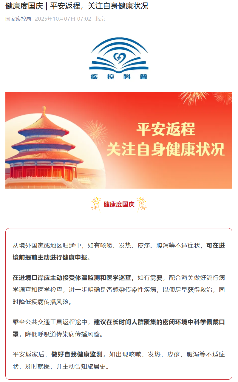 微信公众号截图。 健康提示明确,公众在进境口岸应主动接受体温监测和医学巡查,如有需要,配合海关做好流行病学调查和医学检查,进一步明确是否感染传染性疾病,以便尽早获得救治,同时降低疾病传播风险;乘坐公共交通工具返程途中,建议在长时间人群聚集的密闭环境中科学佩戴口罩,降低呼吸道传染病传播风险;平安返家后,做好自我健康监测,如出现咳嗽、发热、皮疹、腹泻等不适症状,及时就医,并主动告知旅居史。 根据国务院联防联控机制疫情防控组近期印发的《关于做好2025年国庆中秋前后及秋冬季新冠病毒感染等重点传染病防治工作的通知》,各地各部门要统一思想、提高认识,高度重视国庆中秋前后和秋冬季传染病防控工作,坚持底线思维,加强疫情形势分析研判,提早安排部署防控工作,把各项政策措施落实、落细、落到位,确保全国疫情形势总体平稳,为经济社会发展创造良好环境。 |