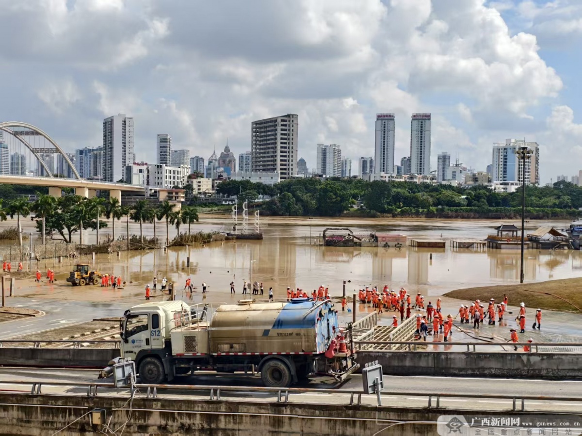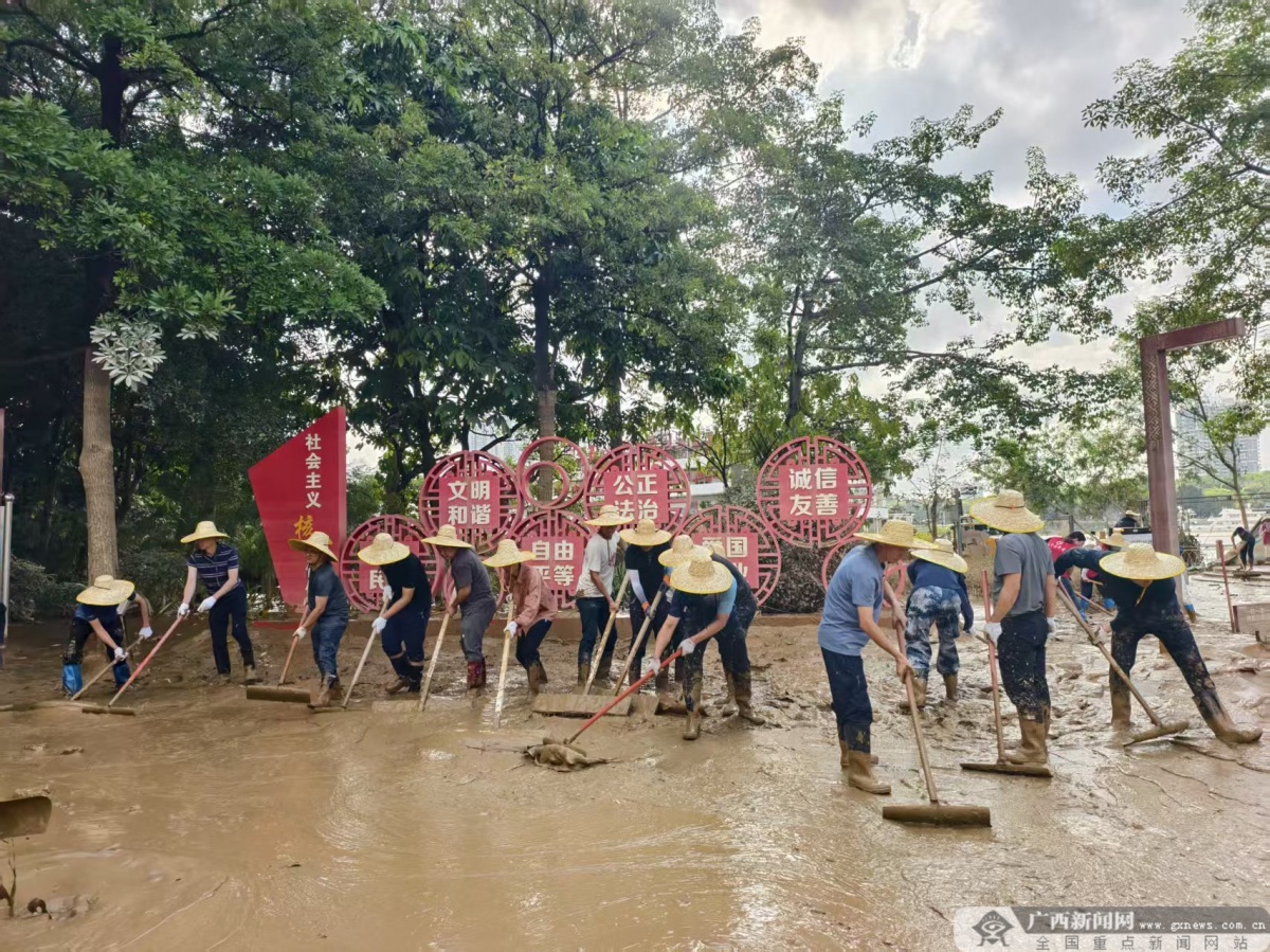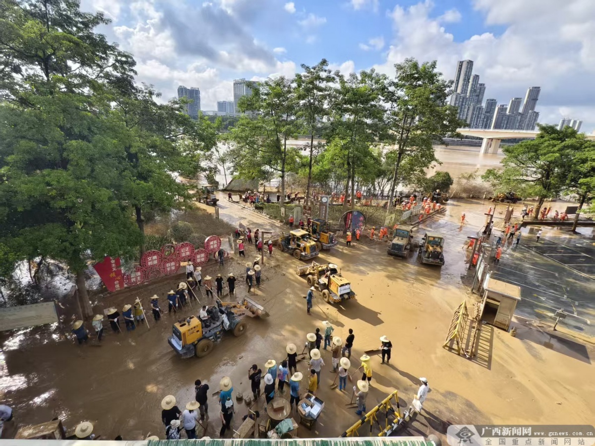 10月13日,邕江水退后,南宁市邕江沿岸公园开启了清淤大行动。街道、消防、公园管理、社区志愿者,以及前来支援的各单位力量,齐心协力投入清淤工作。