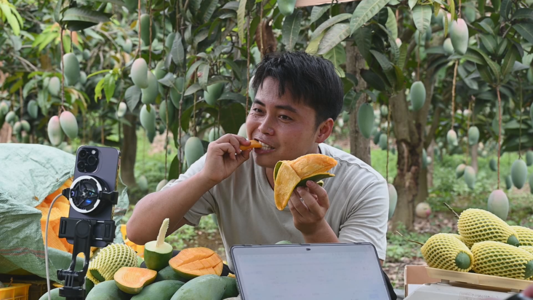 随着百色芒果的火热销售,今年芒果季,田阳区积极发挥本地电商平台优势,拓宽芒果销售渠道,让芒果通过电商平台走向全国各地;同时,吸引全国各路网红达人、电商主播涌入田阳,利用网络流量支持,加大芒果采摘、包装、销售、发货各环节曝光率,推动百色芒果“触网”热销。 网络达人海扬:作为一个新媒体人,应该真实地把农民的不容易、把好水果合理的价格让更多人感受到,努力地去宣传它、推广它,让更多人来到田阳,吃到最好的芒果。