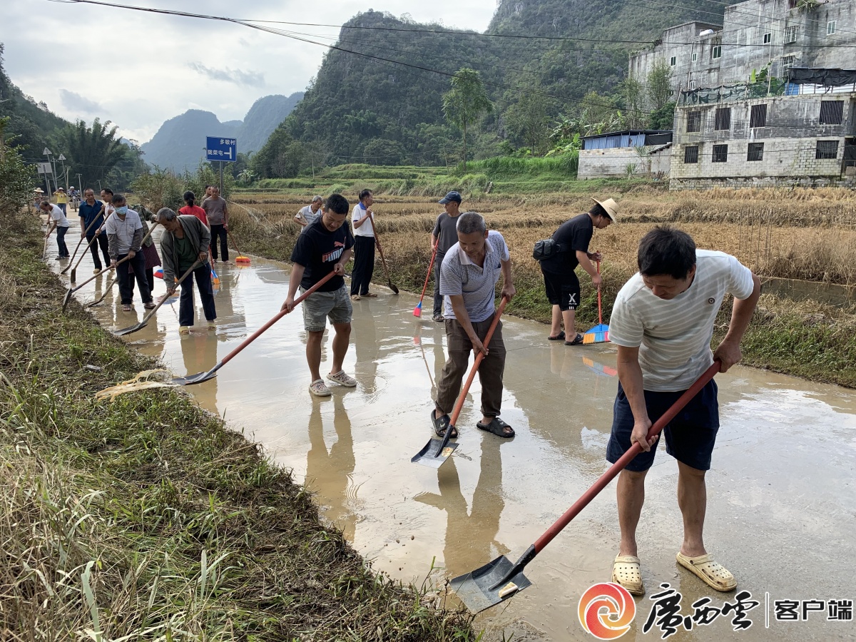 德保县敬德镇古甘屯干群清淤。记者 凌聪 陆旺 摄