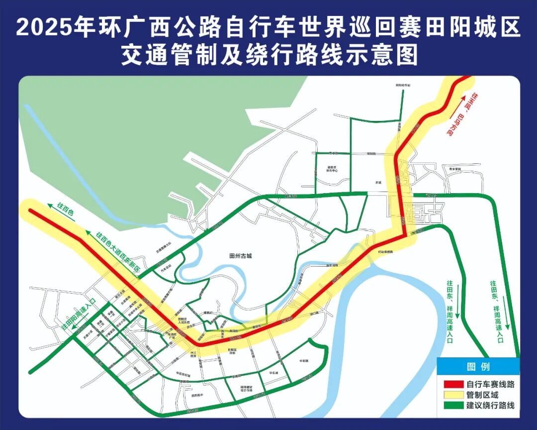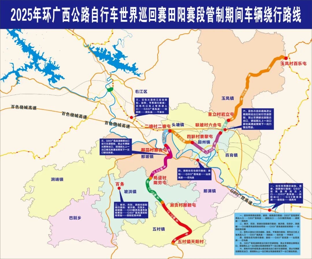 管制时间 10月16日9时至15时 管制路段 对G212国道那吉大桥—百色大道那吉路口路段进行交通管制。 绕行方案 过往车辆可从G69银百高速百色东高速收费站或G69银百高速百东新区高速收费站绕行。(右江区) 管制时间 10月16日9时至15时30分 管制路段 G323国道(田东县与田阳区交界)—G243国道(田东县与巴马县交界)进行交通管制。 绕行方案 过往车辆可从G243国道与S65巴友高速玉圩出口延长线交叉路口绕行高速。(田东县) 其他管制措施 (一)赛事期间,取消上述自行车赛涉及道路(含辅道)的道路停车位(含停车带),禁止一切车辆停放,赛事前停放未驶离的车辆,公安机关交通管理部门将予以拖移。 (二)为确保赛道的绝对安全,公安机关交通管理部门将在比赛当天视情况对直接通向赛道的相关邻近道路实施短时封闭、限制通行等交通限制措施。 (三)严禁任何单位和个人擅自挪用、移动和破坏服务赛事的交通安全保障的设施、设备。 (四)以上限制交通措施的实施,以执勤警力、现场管理人员的现场指挥或设置的标牌、警戒隔离设施明示为准。因赛事时间跨度大、线路长,对道路交通影响大,请广大市民提前做好出行计划,并积极配合管理人员的管理和引导,因实施以上限制交通措施给交通出行带来不便,敬请社会各界谅解。 (五)涉及公共汽车调整的线路和站点,由公共交通行业主管部门另行通告。 河池 河池赛段将于10月16日至18日举行。赛事期间交警部门将对比赛路线及其周边道路分路段、分时段采取临时交通管制措施。 具体路段交通管制时间 巴马赛段 管制时间 10月16日(12:00—17:00)、10月17日(6:00—13:00),具体道路管制时间以赛事指挥部下达封控管制指令为准。 管制路段 10月16日,田东田阳巴马三县交界金三角路口至巴马中心红绿灯路口沿线路段;10月17日,巴马县文化广场至江州东山路口沿线路段。 绕行路线 (一)10月16日:西山往巴马城区方向车辆绕行巴马北从巴马南入城;巴徐红绿灯方向车辆绕行新汽车站从寿乡大道入城;新汽车站桥头车辆绕行河堤路、文化街入城;印象四季酒店路口车辆绕行文化街入城。 (二)10月17日:巴马城区往西山方向车辆绕行巴马南从巴马北驶出;第四幼儿园红绿灯路口车辆绕行城南大道驶入;老车站红绿灯路口车辆绕行环城路、文化街驶入。 (三)寿乡大道沿线单位、居民小区人员及车辆可从河堤路、文化街通行。 东兰赛段 管制时间 10月17日9时至14时(具体道路管制时间以赛事指挥部下达封控管制指令为准)。 管制路段 从G323线东兰县与巴马交界处(三石镇弄规屯)—G323线东兰县东兰镇—县城区五峰路—县城区新城路—G323线红水河大桥—隘洞镇街—G323线东兰县与金城江交界处(隘洞镇牙岁屯)。 绕行路线 (一)由金城江方向前往巴马、百色方向的车辆可以经由金城江西收费站进入G78汕昆高速前往目的地。 (二)由巴马、百色方向前往金城江方向的车辆可以经由百色、巴马、武篆高速收费站进入G78汕昆高速前往目的地。 金城江赛段 管制时间 10月17日9时至18时(具体道路管制时间以赛事指挥部下达封控管制指令为准)。 管制路段 G323线金城江区与东兰县交界处(隘洞镇牙岁屯)、G323线九圩镇、G210线拉显大桥、G210线五圩镇、G210线水任立交桥、G323线河池镇、G323线六圩镇、G323线与城西六十米大道交界处、城西大道、河池市碧桂园路口、金城西路、体育馆、学院路、职教路、金碧路、河池市碧桂园路口。 绕行路线 (一)由金城江前往南丹、巴马、百色方向的车辆可以经由金城江西高速路收费站进入G75兰海高速、G78汕昆高速前往目的地。 (二)由南丹前往金城江方向的车辆可以经由南丹高速路收费站、金城江机场高速路收费站进入G78汕昆高速、G75兰海高速前往目的地。 (三)由都安前往金城江、南丹等方向的车辆可以经由都安收费站进入G75兰海高速前往目的地。 (四)由金城江前往都安等方向的车辆可以经由金城江西高速路收费站进入G75兰海高速前往目的地。 (五)宜州方向过境车辆由金城江东高速口分流上高速路。 (六)金城江城区出城车辆上高速车辆由南桥红绿灯路口分流往西环路-乾宵路-金城江西高速路口上高速路。 (七)金城江城区出城车辆往河池镇车辆由南桥红绿灯路口分流往建设路-城西路-六甲方向出城。 (八)六甲方向进出城车辆需往城西路、建设路通行。 (九)交通管制期间金城江区教育路实施临时双向通行(交通管制结束后恢复单向通行)。 宜州赛段 管制时间 城区道路:10月17日12时至18日16时(如有调整,以赛事指挥部下达的封控管制指令为准)。 郊区道路:10月18日9时30分至13时10分(如有调整,以赛事指挥部下达的封控管制指令为准)。 管制路段 城区道路实行分段交通管制: (一)10月17日12时00分至18日12时30分,黄莺路中山大道路口至龙隐路口(山水二路路口),宜岑路(山水一路)全段。 (二)10月17日12时00分至18日12时30分,南山路中山大道路口至龙隐路口(山水二路路口)。 (三)10月18日09时00分至18日12时30分,中山大道黄莺路口至迎宾路口的北幅路,迎宾路中山大道路口至龙溪路口的东幅路。 (四)10月17日12时00分至18日16时00分,中山大道中心广场段北幅路面。 (五)10月18日10时00分至18日12时30分,中山大道南山路口至迎宾路口、迎宾路中山大道路口至状元桥南(龙江二桥)、状元桥、冯京路全段、龙江桥(龙江一桥)、龙江路龙江桥南段、解放路全段