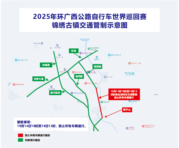 2025年环广西公路自行车世界巡回赛 (简称环广西世巡赛) 正在如火如荼地进行中 20支车队将跨越广西6市 上演速度与激情的较量 最终决出赛段总冠军 今天(10月15日) 环广西世巡赛 崇左—靖西赛段激情开赛 一起来感受现场氛围 广西云-广西日报记者 李慧子 见习记者 晏明珠 摄制。 为确保赛事安全顺利举行 广西多地交通部门 发布关于道路限制的临时通告 在观赛前 一起了解一下比赛期间 部分城市道路交通管制情况 ↓↓↓ 百色 百色赛段将于2025年10月15日至16日举行,途经靖西市、德保县、田阳区、右江区、田东县5个县(市、区)部分道路。 具体路段交通管制时间 崇左—靖西赛段 管制时间 10月14日18时至16日14时 管制路段 狮子山路口—宝珠路口—双拥路口(锦绣古镇路段)实施全封闭交通管制,禁止所有车辆通行,过往车辆从靖边路、凤凰路绕行。锦绣古镇、悦龙湾小区及周边住户,从原通信连小路、麒麟路、迎宾大道绕行。绣球大道锦绣古镇路段辅道严禁车辆停放。(靖西市)