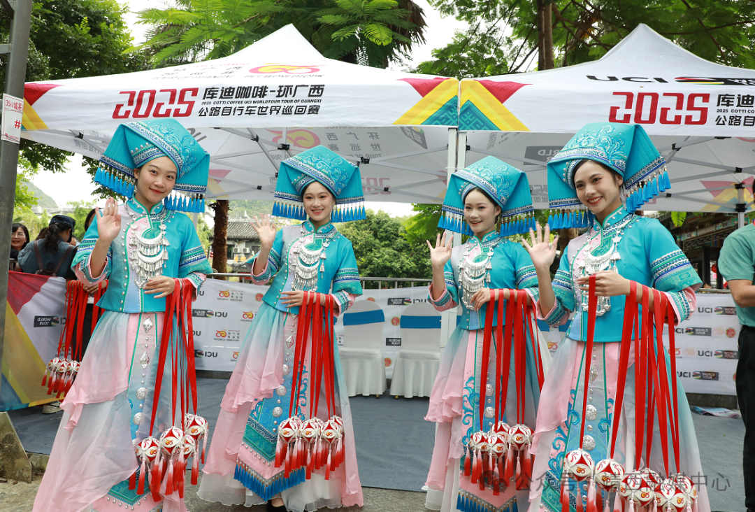 壮族姑娘们将融合靖西传统刺绣技艺与世巡赛LOGO元素的绣球,逐一送到每位车手手中。图源:靖西融媒中心 在靖西市锦绣古镇,《骑开得胜》《糯意绵绵》等非遗暖场表演让车手和游客流连忘返。“靖西山水和民俗文化让人印象深刻,这是我在欧洲赛场上没见到过的,很享受在美景中骑行。”法国参赛车手保罗·马尼耶说,得知绣球是壮族人民的“传情物”后,他想把它送给喜欢的人。