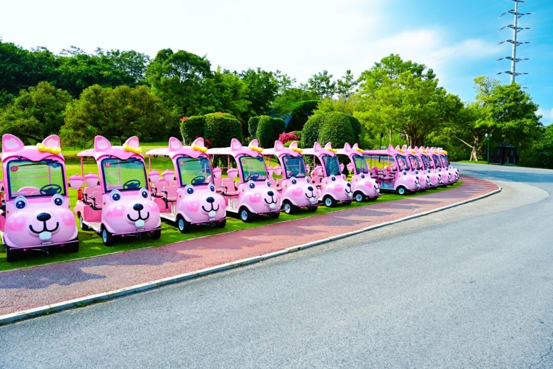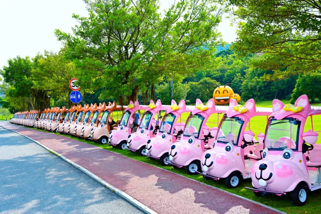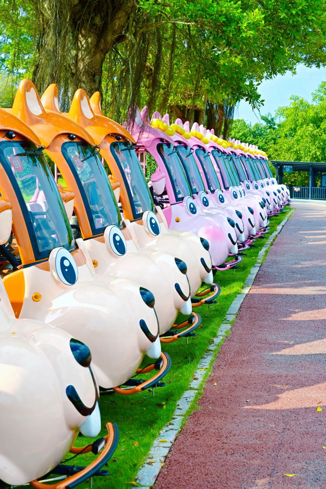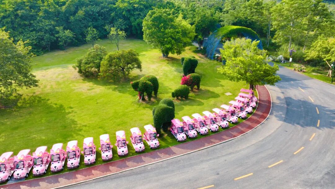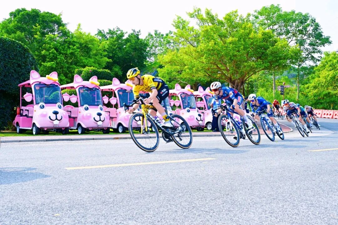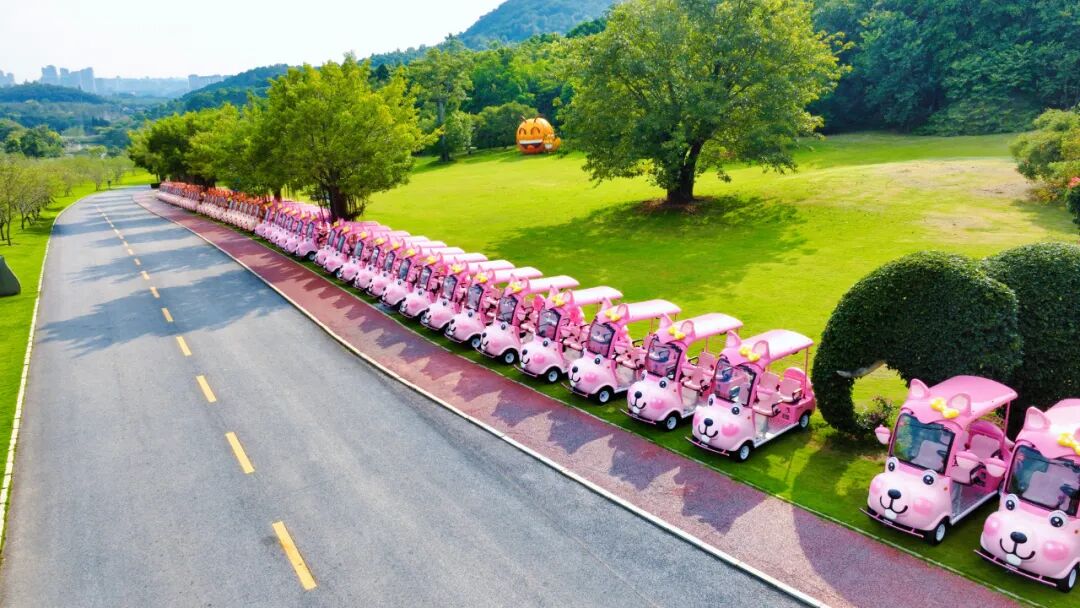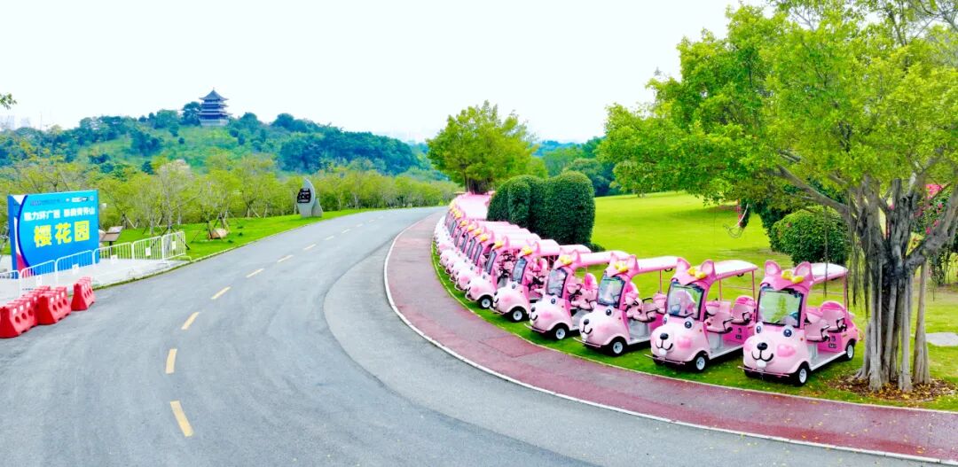 除了加油助威团,今年的青秀山赛段,融入了更多有趣元素于沿途风景中。如在樱花园的大草坪,青秀山今年新推出的小松鼠代步车巧妙排布成一列,为选手鼓劲。