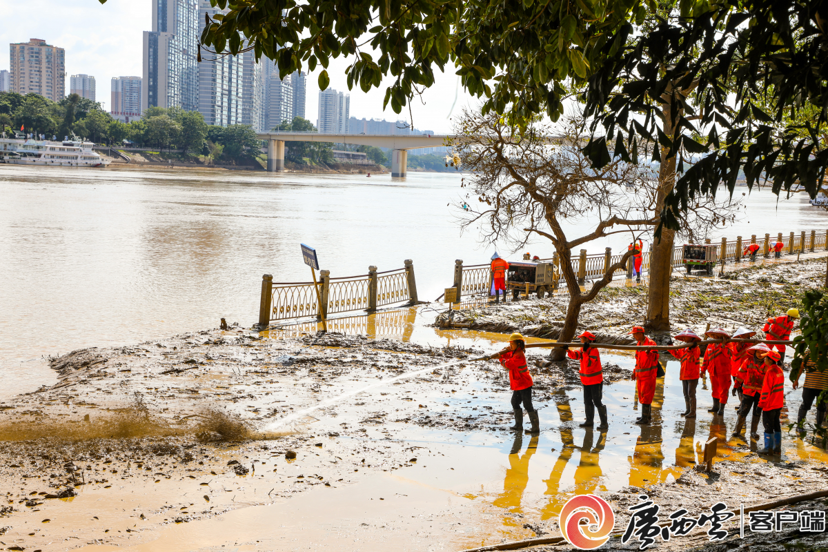 邕江沿岸的环卫工人开展清淤工作。卢伊琳 摄 南宁市市政和园林管理局介绍,截至10月16日,郁江2025年第2号洪水退水阶段,南宁市累计出动约2.63万人次,投入车辆和冲洗设备3768台次,基本完成邕江沿岸清淤工作,累计清淤面积466.52万平方米,消杀面积247.32万平方米。记者了解到,目前邕江沿岸公园正有序开放已恢复的区域,但受洪水长时间浸泡影响,部分公园内的设施设备、绿化等还需进一步检修和恢复,广大市民游客需谨慎游玩。 |