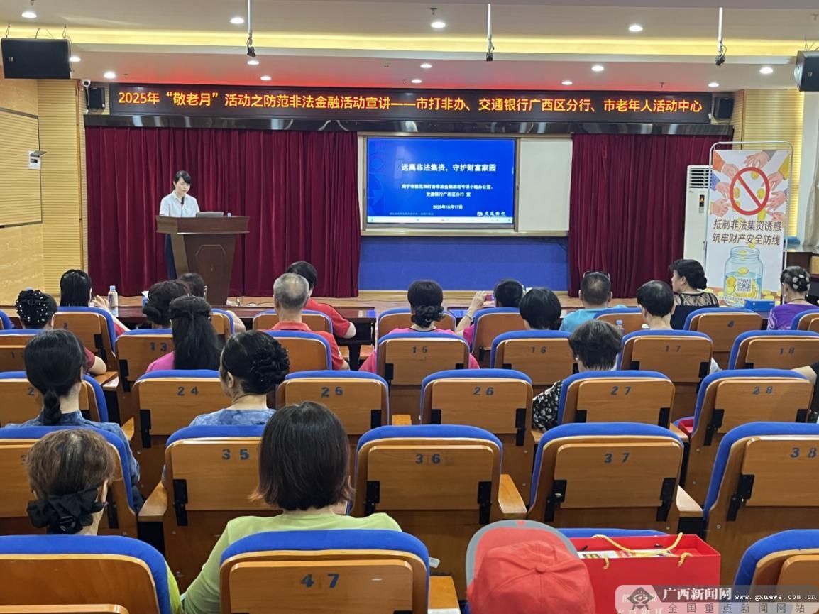 为深入贯彻落实自治区关于2025年“敬老月”活动以及南宁市防范和打击非法金融活动专项小组办公室统一工作部署,提高老年群体非法集资识别和防范能力,切实维护老年群体的合法权益,筑牢老年群体金融安全防线,10月17日上午,南宁市委金融办联合交通银行广西区分行、南宁市老年人活动中心举办主题为“守住钱袋子,护好幸福家”的防范非法金融活动宣讲会,宣讲会由交通银行广西区分行员工主讲。
