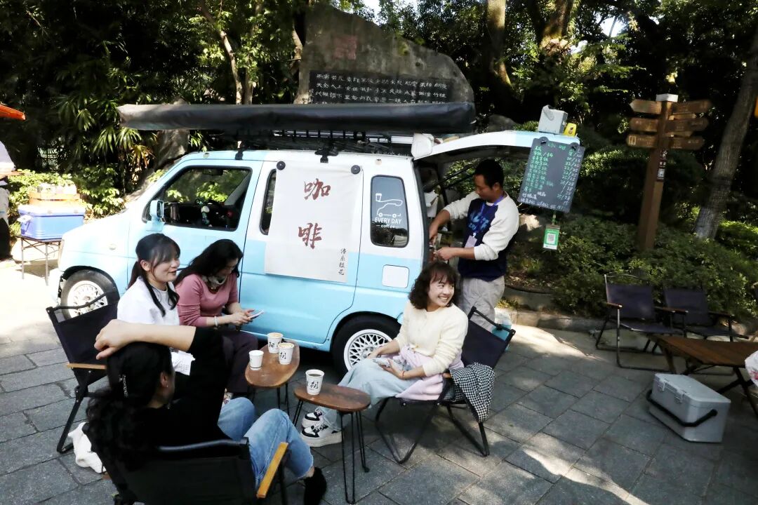 市民、游客对各种文创工艺品爱不释手。记者 陈静 摄 “今年专门为爱咖啡的朋友们准备了桂花风味的特调饮品。”来自阳朔的摊主苏裕捷(小杰)一边招呼着客人一边介绍。他的“小杰咖啡”摊位就设在古南门旁,空气中除了咖啡香,还弥漫着邻摊吐司与菠萝包的阵阵甜香,营造出轻松愉悦的休憩空间。“咖啡的醇苦里带着桂花的清甜,很有桂林的韵味,一下子就把氛围感拉满了。”几位本地的年轻人围坐在一旁的露营椅上,边喝咖啡边拍照。其中一位表示:“在古南门这样有历史感的地方,喝一杯融合了本地特色的现代咖啡,是一种很奇妙的体验。”苏裕捷希望,游客能通过这杯“桂林专属”的桂花咖啡,记住城市的独特味道。