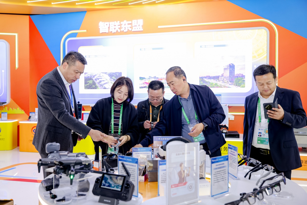 第八届进博会,广西综合形象馆吸引中外客商参观。自治区商务厅 本届进博会的广西综合形象馆设置开放门户、智联东盟、桂品臻选、消费焕新四大主题板块,AI+广西制造、东盟特色商品、老字号与非遗新品、国潮文创等特色产品齐聚亮相。 今年东博会爆火的“迈越AI翻译提词眼镜”位于智联东盟展区,受到不少海外客商青睐。据了解,这款AI眼镜是由广西本土成长起来的国家高新技术企业迈越科技股份有限公司自主研发生产,不仅具备传统眼镜的轻便外观,更通过镜片投影、语音交互、实时翻译等技术,将提词器、翻译机等功能集于一身。