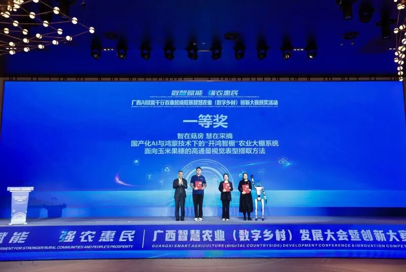 颁奖现场。主办方供图 这场智慧农业盛会在解锁“种田”新姿势的同时,广西智慧农业模型“出海”呼之欲出。 《智在菇房 慧在采摘》把东盟合作赛道冠军证书揽在手。项目负责人介绍,智慧食用菌方舱解决了食用菌栽培痛点,全周期精准掌握生长数据,不但节约人力、提高效率,占地面积小,更有机械手采摘,A菇率超95%。“当下技术输出是主流,我们是大集成模型‘出海’。”这位负责人表示,马来西亚已经预订了十几个方舱。 《国产化AI与鸿蒙技术下的“开鸿智棚”农业大棚系统》荣获专业赛道第一名。相对而言,传统物联网只是数据采集,鸿蒙技术基于数据作出智能判断。“这个系统打通了数据壁垒,让生产变得非常智能。”项目经理罗楚表示。