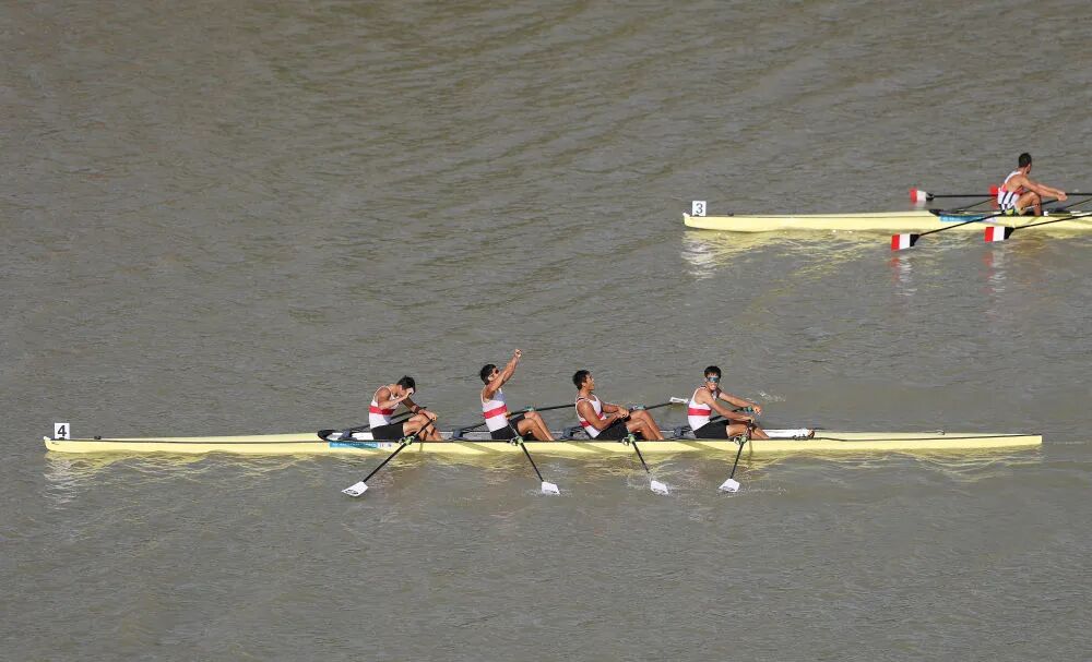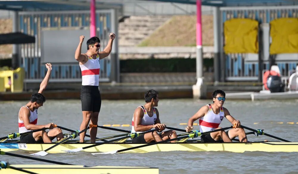 11月10日第十五届全国运动会赛艇项目决赛在广州举行江苏队在男子四人双桨决赛中夺得冠军这是十五运会开幕式后产生的首枚金牌