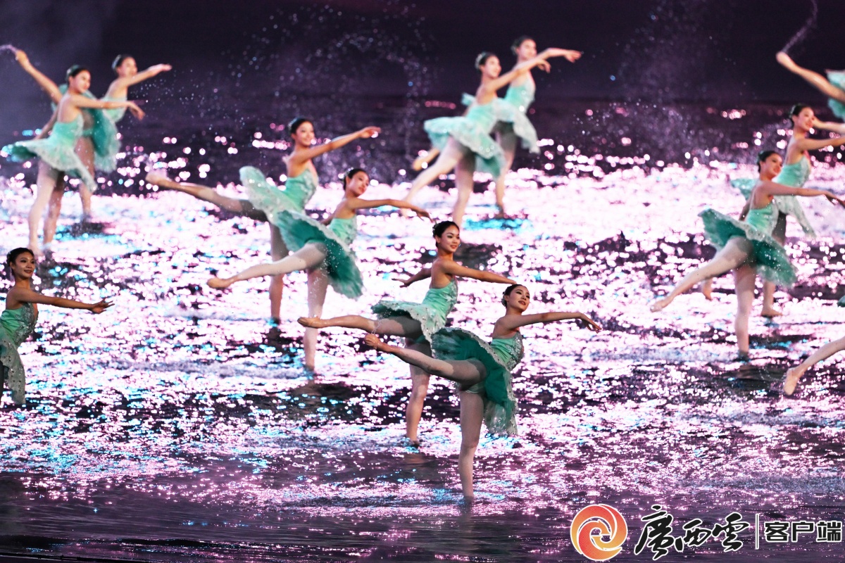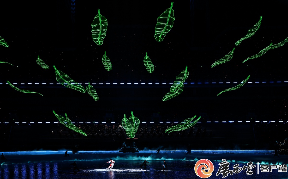 开幕式现场。组委会供图 舞台之上,环形水幕宛如魔法般“造出一片海”,将岭南水文化的灵动意象演绎得淋漓尽致。演出以“同心圆”为基底,从空灵走向饱满,仿佛诉说着粤港澳大湾区依海而生、向海而兴的故事。古老的青铜勾鑃被具身智能机器人敲响,科技与古韵在此刻完成跨越两千年的对话;《沧海一声笑》的旋律中,咏春与南拳刚柔并济;粤剧名家的创新“粤歌”将传统与现代完美融合。这些细节无不体现着创作团队对岭南文化精髓的深刻理解与现代表达。