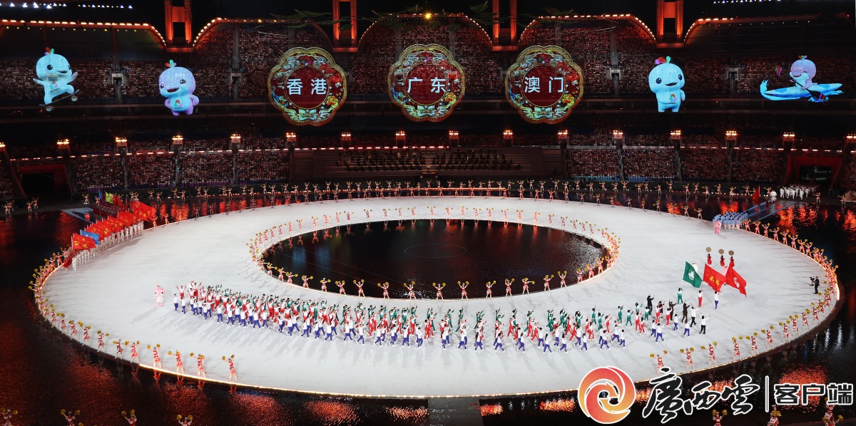 灯光璀璨铸就文体交融的华丽篇章。组委会供图 开幕式总时长只有75分钟,却在有限的时间里展现了无限的精彩。全国37个代表团的运动健儿们从水舞台之畔一一走过。当粤港澳代表团携手进场那一刻,现场爆发出热烈的掌声与欢呼声——三地同心的一幕,恰是本届全运会最动人的注脚。文艺展演以《圆梦未来》为主题,将家国的厚重、湾区的灵动、体育的活力与科技的新颖巧妙浓缩成21分钟的华彩篇章。