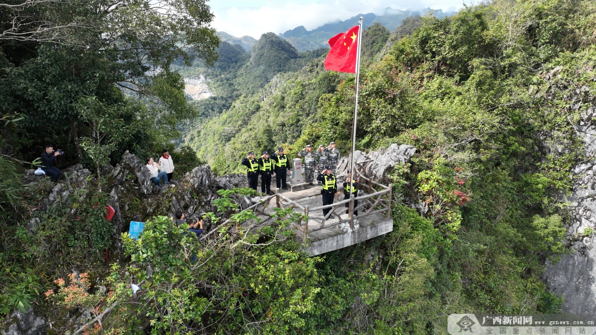 活动现场。记者 阳继乐 摄 广西新闻网南宁11月11日讯(记者 樊成甫 阳继乐 通讯员 谭苏侣 吴婉倩)清晨的薄雾尚未散去,那坡县百南乡红石山的1356级石阶上,一支特殊的队伍正向着海拔1096米的中越588号界碑攀登。11月7日,2025年“走边关”之“卫国戍边有我”主题深度宣传采访团与当地护边员、百南边境派出所移民管理警察一同踏上这段在悬崖峭壁上开凿出的“天梯”,在祖国南疆之巅举行了一场庄严的升旗仪式。