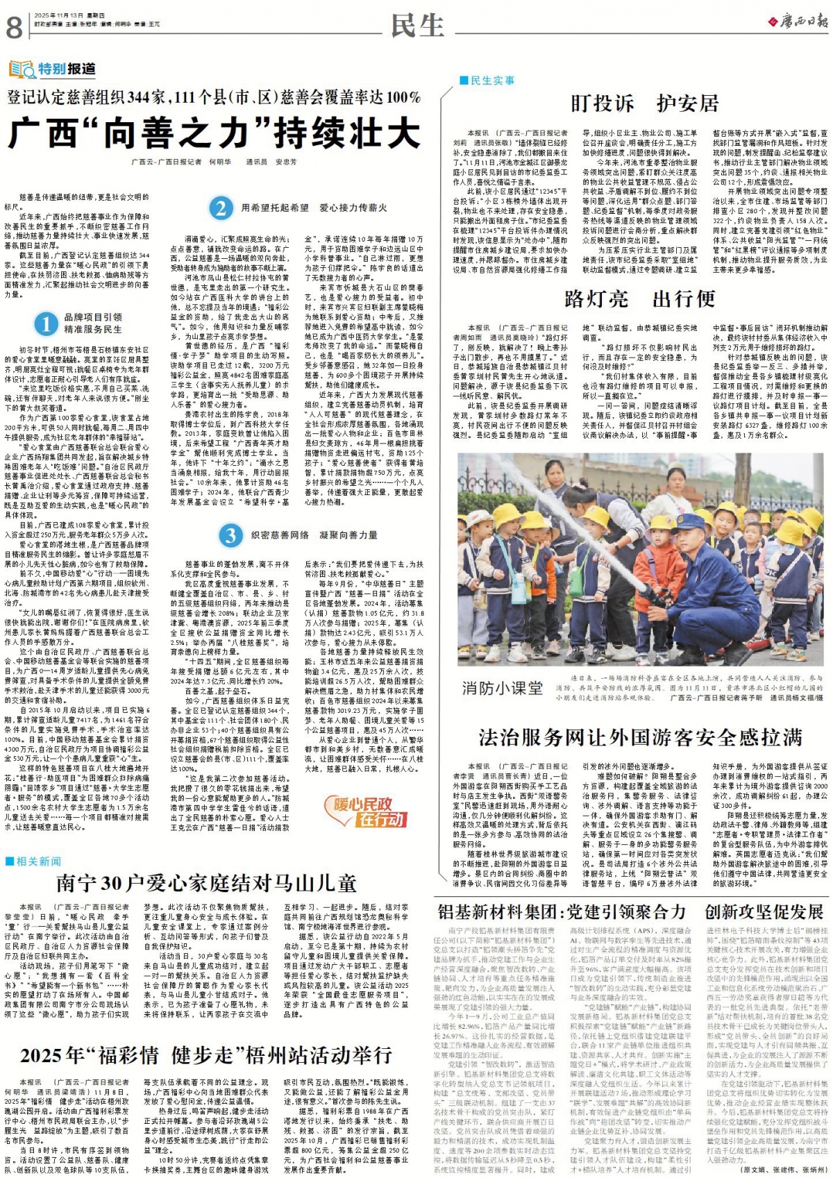 慈善是传递温暖的纽带,更是社会文明的标尺。 近年来,广西始终把慈善事业作为保障和改善民生的重要抓手,不断织密慈善工作网络,推动慈善力量持续壮大、事业快速发展,慈善氛围日益浓厚。 截至目前,广西登记认定慈善组织达344家。这些慈善力量在“暖心民政”的引领下勇担使命,在扶弱济困、扶老救孤、恤病助残等方面精准发力,汇聚起推动社会文明进步的向善力量。 品牌项目引领 精准服务民生 初冬时节,梧州市苍梧县石桥镇东安社区的爱心食堂里暖意融融。亮堂的烹饪区厨具整齐,明厨亮灶全程可视;就餐区桌椅专为老年群体设计,志愿者正耐心引导老人们有序就座。 “来这里吃饭价格实惠,不用自己买菜、洗碗,还有伴聊天,对老年人来说很方便。”刚坐下的黄大叔笑着道。 作为广西第100家爱心食堂,该食堂占地200平方米,可供50人同时就餐,每周二、周四中午提供服务,成为社区老年群体的“幸福驿站”。 “爱心食堂由广西慈善联合总会联合爱心企业广西扬翔集团共同发起,旨在解决城乡特殊困难老年人‘吃饭难’问题。”自治区民政厅慈善事业促进处处长、广西慈善联合总会秘书长黄禹治介绍,爱心食堂通过政府支持、慈善捐赠、企业让利等多元筹资,保障可持续运营,既是互助互爱的生动实践,也是“暖心民政”的具体体现。 目前,广西已建成108家爱心食堂,累计投入资金超过250万元,服务老年群众5万多人次。 爱心食堂的落地生根,是广西慈善品牌项目精准服务民生的缩影。曾让许多家庭愁眉不展的小儿先天性心脏病,如今也有了救助保障。 前不久,中国移动爱“心”行动——困境先心病儿童救助计划广西第六期项目,组织钦州、北海、防城港市的42名先心病患儿赴天津接受治疗。 “女儿的嘴唇红润了,恢复得很好,医生说很快就能出院,谢谢你们!”在医院病房里,钦州患儿家长黄妈妈握着广西慈善联合总会工作人员的手感激万分。 这个由自治区民政厅、广西慈善联合总会、中国移动慈善基金会等联合实施的慈善项目,为广西0—14周岁适龄儿童提供先心病免费筛查,对具备手术条件的儿童提供全额免费手术救治,赴天津手术的儿童还能获得3000元的交通和食宿补助。 自2015年10月启动以来,项目已实施6期,累计筛查适龄儿童7417名,为1461名符合条件的儿童实施免费手术,手术治愈率达100%。目前,中国移动慈善基金会累计捐资4300万元,自治区民政厅为项目协调福彩公益金530万元,让一个个患病儿童重获“心”生。 这样的特色慈善项目在八桂大地遍地开花:“桂善行·助医项目”为困难群众扫除病痛阴霾;“回馈家乡”项目通过“慈善+大学生志愿者+服务”的模式,覆盖全区各地70多个活动点,1500余名农村大学生志愿者为1.5万余名儿童送去关爱……每一个项目都精准对接需求,让慈善暖意直达民心。 用希望托起希望 爱心接力传薪火 涓滴爱心,汇聚成照亮生命的光;点点善意,铺就改变命运的路。在广西,公益慈善是一场温暖的双向奔赴,受助者转身成为施助者的故事不断上演。 河池市凤山县松仁村拉协屯的黄世德,是屯里走出的第一个研究生。如今站在广西医科大学的讲台上的他,总不忘提及当年的境遇:“福彩公益金的资助,给了我走出大山的底气”。如今,他用知识和力量反哺家乡,为山里孩子点亮求学梦想。 黄世德的经历,是广西“福彩情·学子梦”助学项目的生动写照。该助学项目已走过12载,3200万元福彩公益金,照亮4842名困难家庭高三学生(含事实无人抚养儿童)的求学路,更培育出一批“受助思源、助人乐善”的爱心接力者。 贵港农村出生的陈宇良,2018年取得博士学位后,到广西科技大学任教。2013年,家庭变故曾让他陷入困境,后来希望工程“广西青年英才助学金”帮他顺利完成博士学业。当年,他许下“十年之约”:“滴水之恩当涌泉相报,给我十年,用行动回报社会。”10余年来,他累计资助46名困难学子;2024年,他联合广西青少年发展基金会设立“希望科学+基金”,承诺连续10年每年捐赠10万元,用于资助困难学子和边远山区中小学科普事业。“自己淋过雨,更想为孩子们撑把伞。”陈宇良的话道出了无数接力者的心声。 来宾市忻城县大石山区的樊春艺,也是爱心接力的受益者。初中时,来宾市兴宾区妇联副主席蒙晓梅为她联系到爱心资助;中考后,又推荐她进入免费的希望高中就读,如今她已成为广西中医药大学学生。“是蒙老师改变了我的命运。”而蒙晓梅自己,也是“喝百家奶长大的领养儿”。受乡邻善意感召,她32年如一日投身慈善,为600多个困境孩子开展持续帮扶,助他们健康成长。 近年来,广西大力发展现代慈善组织,建立完善慈善动员机制,培育“人人可慈善”的现代慈善理念,在全社会形成浓厚慈善氛围,各地涌现出一批爱心人物和企业:百色市田林县妇女麦琼方,46年用一根扁担挑着捐赠物资走进偏远村屯,资助125个孩子;“爱心慈善使者”获得者黄培智,累计捐款捐物超750万元,点亮乡村振兴的希望之光……一个个凡人善举,传递着强大正能量,更激起爱心接力热潮。 织密慈善网络 凝聚向善力量 慈善事业的蓬勃发展,离不开体系化支撑和全民参与。 我区高度重视慈善事业发展,不断健全覆盖自治区、市、县、乡、村的五级慈善组织网络,两年来推动县级慈善会增长208%;联动企业及京津冀、粤港澳资源,2025年前三季度全区接收公益捐赠