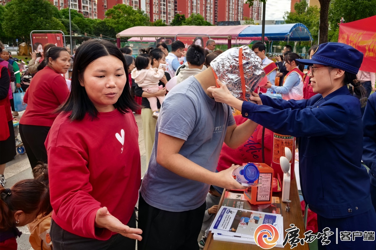 现场群众体验佩戴火灾逃生面具。何小翠 摄 实操体验区人气高涨。消防宣传员现场演示灭火器、火灾逃生面具、消防水带的正确使用方法,细致讲解专业消防设施的功能与操作要点,并邀请居民亲手体验。“原来佩戴火灾逃生面具得先拔前后两个塞子,水带连接还有这么多小技巧!”居民李大哥体验后说道,“以前光听人说,今天亲手试过才明白,这些实用技能真得好好学,关键时候能派上大用场。”