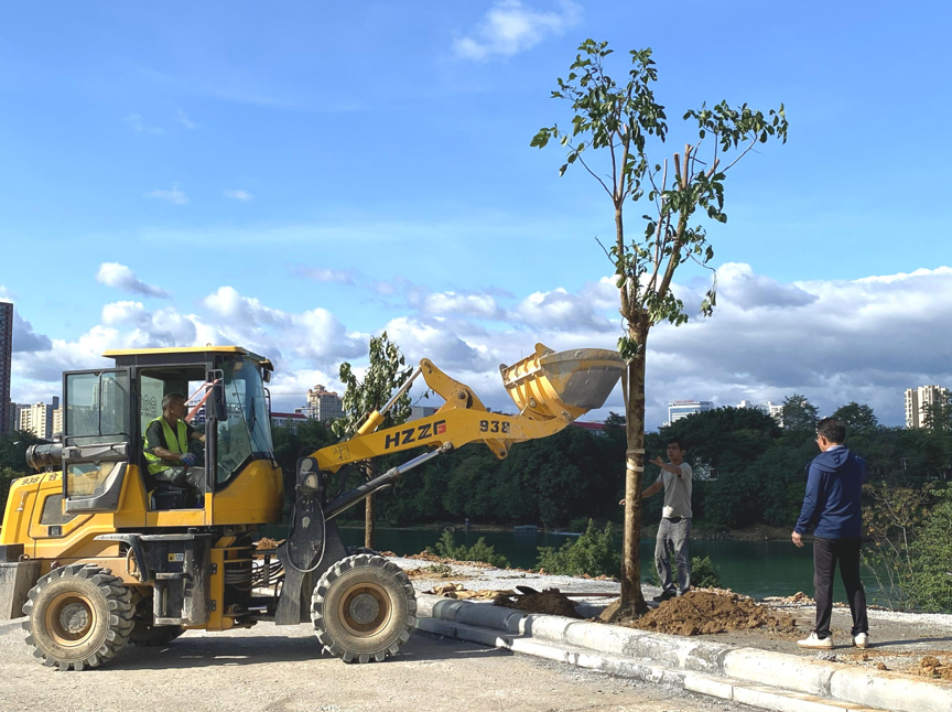 工人对新栽种的绿化树进行回填泥土。 据了解,百色起义纪念园(5A级景区)配套路贯通工程起点为已建成的迎龙路(原滨江大道)终点,向北延伸至城东大道与站前大道交叉口。道路按城市次干路标准建设,红线宽度26米,设计时速40公里,全长572.5米。建设内容涵盖道路、交通、涵洞、给排水、照明、电缆沟及绿化等配套工程。