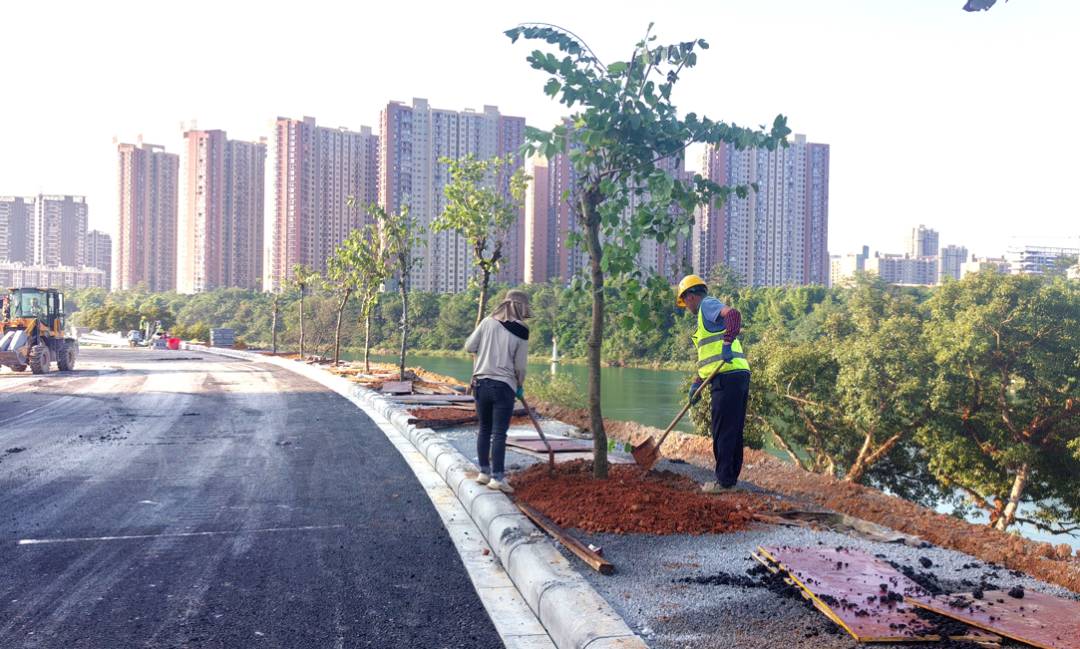 连接城东大道的路面已铺设沥青。 记者在现场看到,新铺设的沥青路面平整开阔,工人们在各自岗位上紧张有序地作业。“现在我们正在抓紧进行压路和铺路作业,大家都主动加班加点,希望早点把这条路修通,让市民游客出行更方便。”工人冯师傅笑着说道,“这条路修好了,对百色来说是件大好事,不仅能美化城市面貌,也能给游客留下好印象。” 在施工现场的另一侧,绿化作业同步展开。吊装机将一棵棵高约两三米的树苗稳稳托起,缓缓放入树坑,工人们随即上前,扶正树干、回填泥土、踩实加固、浇水定根,动作娴熟流畅。