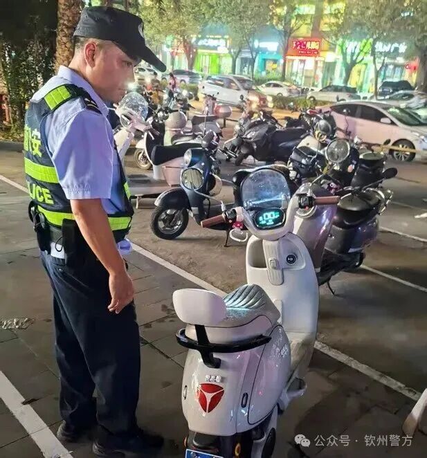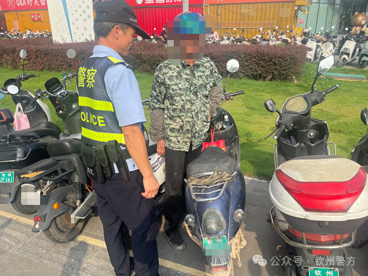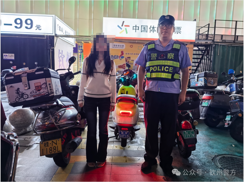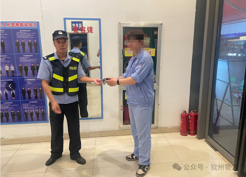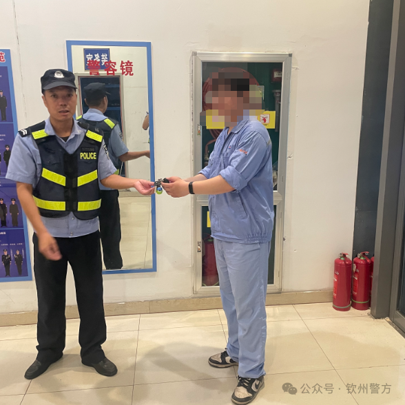 10月13日,钦州市公安局高新派出所巡逻组执勤辅警钟鸣、赖朝云在吾悦公馆B区巡逻时,发现一辆电动车处于通电待启动状态,钥匙竟未拔下。二人取下钥匙妥善保管,并在车头醒目位置张贴提示便条,指引车主前往高新派出所吾悦广场执勤点领取。当日下午,车主黄某怡核对身份信息无误后,顺利领回钥匙,连声道谢。