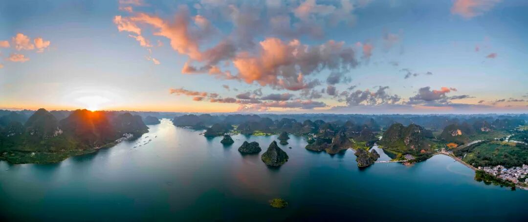 浩坤湖。罗小凤 摄 从渔人码头远眺,停泊的游船与连绵峰林构成不输桂林的山水美景。38公里环湖骑行道将湖光山色串联成卷,湖心的飞檐亭台是点睛之笔,四面临水的位置使其成为观赏日出日落的绝佳地点。全透明的玻璃无影桥带来踏水而行的奇妙体验,晴日里,桥面与湖水折射出独特光影,营造出“无影”的视觉体验。 浩坤湖不仅风景秀美,更是一座天然的地质博物馆。湖中岛屿星罗棋布,沿岸发育着天坑、溶洞等丰富的地质遗迹,展现了典型的岩溶地貌特征。 百色另一颗“水上明珠”渠洋湖,则以“广西版千岛湖”的风情吸引着游人。34公里环湖公路环绕湖面,24座孤岛星罗棋布,有的形似卧虎,有的状如莲花……游客可选择骑行环湖,在甘蔗田与稻田的清香中感受田园风光;也可夜宿湖畔露营地,看银河倒映湖面。最具特色的莫过于体验壮族渔家生活——随当地阿妈学撒网捕鱼,将新鲜湖鱼用山泉水炖煮,奶白色的鱼汤鲜美醇厚。