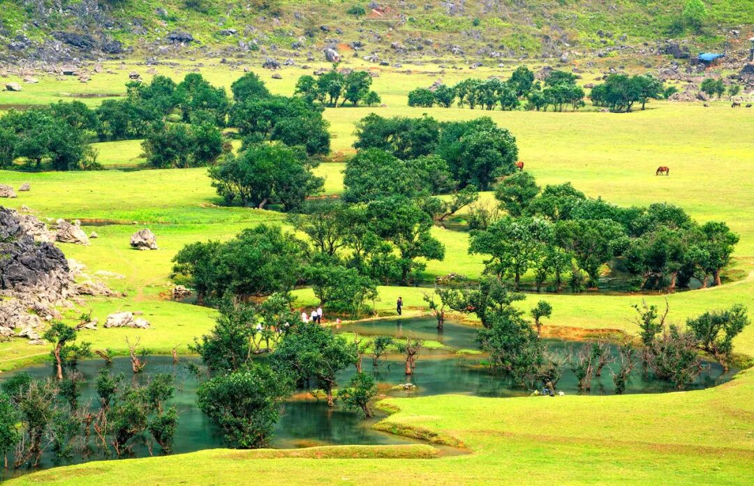 渠洋湖美景。邱加西 摄 德保县的陇卡赖小众秘境,是喀斯特地貌原始之美的又一力证。每逢雨季,山谷间汇成的蜿蜒河流在阳光下泛着渐变的青绿色泽,宛若一条游龙静卧于宽阔草甸,因而得名“青龙湖”。这里的美,在于浑然天成的野趣——没有栈道围栏的束缚,唯有自在生长的绿树野花、悠闲踱步的牛羊与偶尔掠过的飞鸟。当阳光洒落,将湖水浸染成通透的碧色,倒映着如黛远山,草甸的新绿在脚下绵延,远峰如淡墨层叠晕染。只需轻装漫步,便能沉浸于这片未被尘嚣侵扰的天地,感受自然最本真的馈赠。