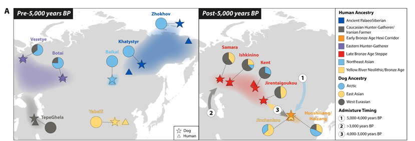 △欧亚大陆家犬与人类共迁移示意图 家犬是人类第一个驯化的动物,考古证据表明至少一万年前欧亚大陆多处均出现了犬的身影,其起源、扩散以及与人类迁徙的互动关系等科学问题对于理解动物驯化和人类文明传播都至关重要,因此长期受到学界的关注。早期基因组研究表明,家犬早在两万年前就已出现了血统分化并于欧亚大陆广泛扩散,但这些扩散是否与特定人类文化群体相关,以及家犬在古代社会中的角色,尚缺乏全面的基因组层面的研究。中国作为家犬的可能驯化中心和重要迁移节点,是研究以上问题的破题之处,但是缺少中国古代家犬的基因组数据成了最主要的限制。 科研团队这项研究首先发现中国五千年前存在独特的家犬古老血统,随后数千年中国古代家犬逐渐出现来自西伯利亚和西方的古代家犬血统渗入,同时来自中国的古老东亚祖份也广泛扩散到了欧亚草原多处。团队通过与人类古基因组数据和证据对照,发现家犬数次渗入事件与人类的多次迁徙高度重合。如东西伯利亚早全新世家犬谱系与同时期人类谱系的分布高度吻合。此外,欧亚草原地区家犬中西方祖分的增加也与古人类迁移历史相吻合,具体而言我们发现欧亚草原前期的新石器时代家犬和东欧狩猎采集人群相关,后期的青铜时代家犬和伊朗农耕人群和高加索狩猎采集者相关。 通过对比研究和多方证据的互相验证,团队最终证明,近一万年来家犬与人类存在密切共迁移,不同时期不同人群携带各自的犬通过欧亚草原和古丝绸之路等路线进行跨洲的大迁移,这表明了家犬与人的无与伦比亲密关系,从欧亚草原到河西走廊的家犬万年来血统流动,也映射出古代文明的互联互通。 据了解,这一基于古基因组分析的方法将扩展到其他家养动物,如马牛羊等家畜,进一步揭示它们在人类历史中的作用,发掘国内家养动物丰富的遗传资源与潜力,为动物资源的开发利用提供更坚实的理论基础。 |
