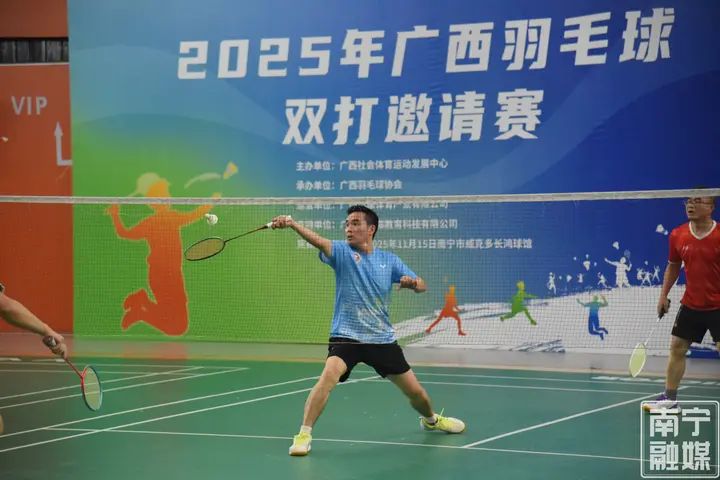 11月15日,2025年广西羽毛球双打邀请赛在南宁维克多长鸿球馆开赛,66名选手分组对抗,挥汗竞技,在场馆内掀起一股羽毛球运动热潮。