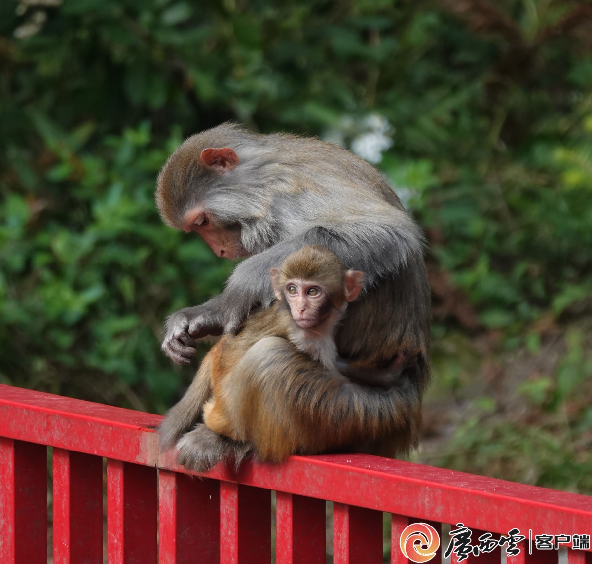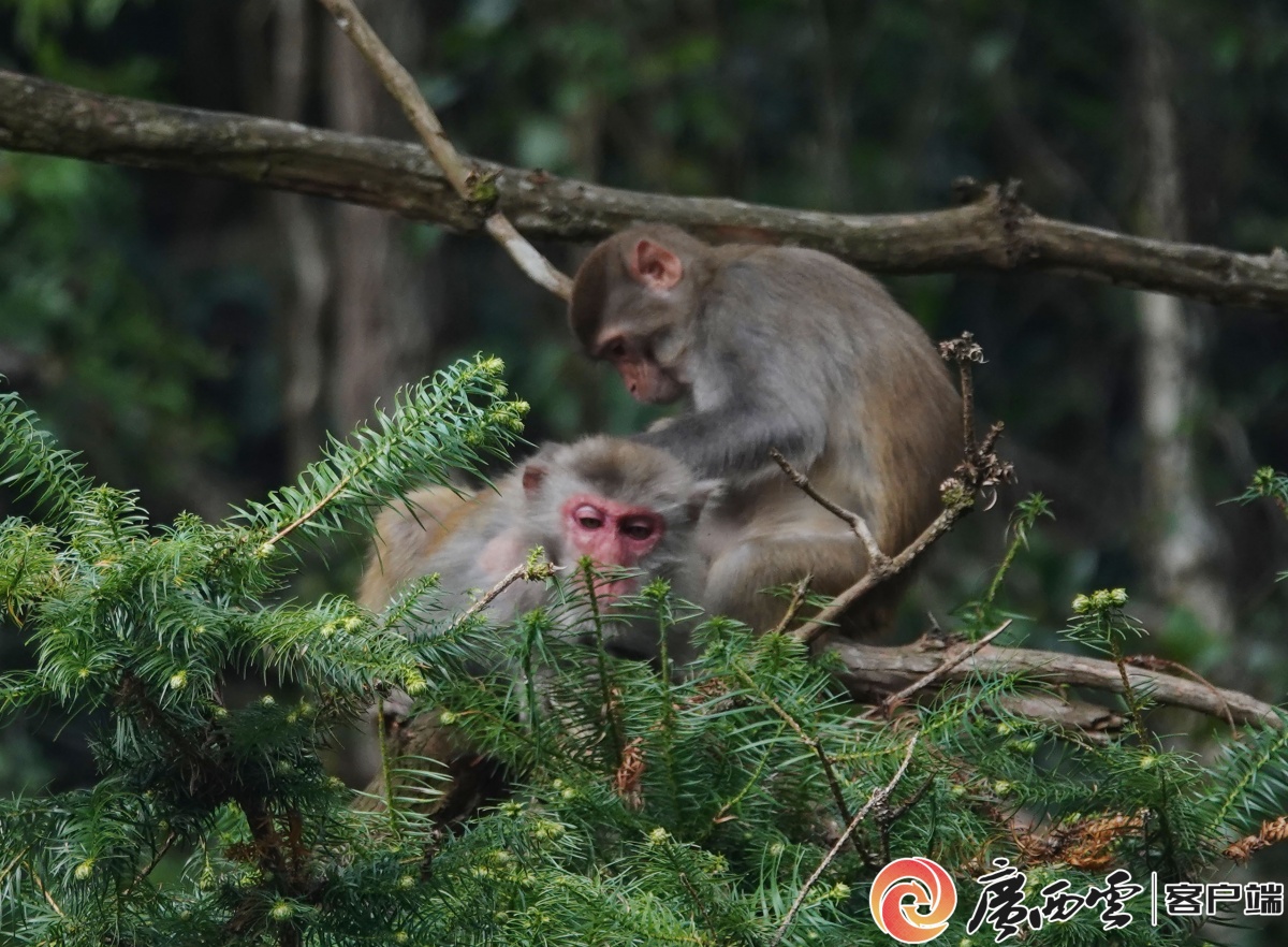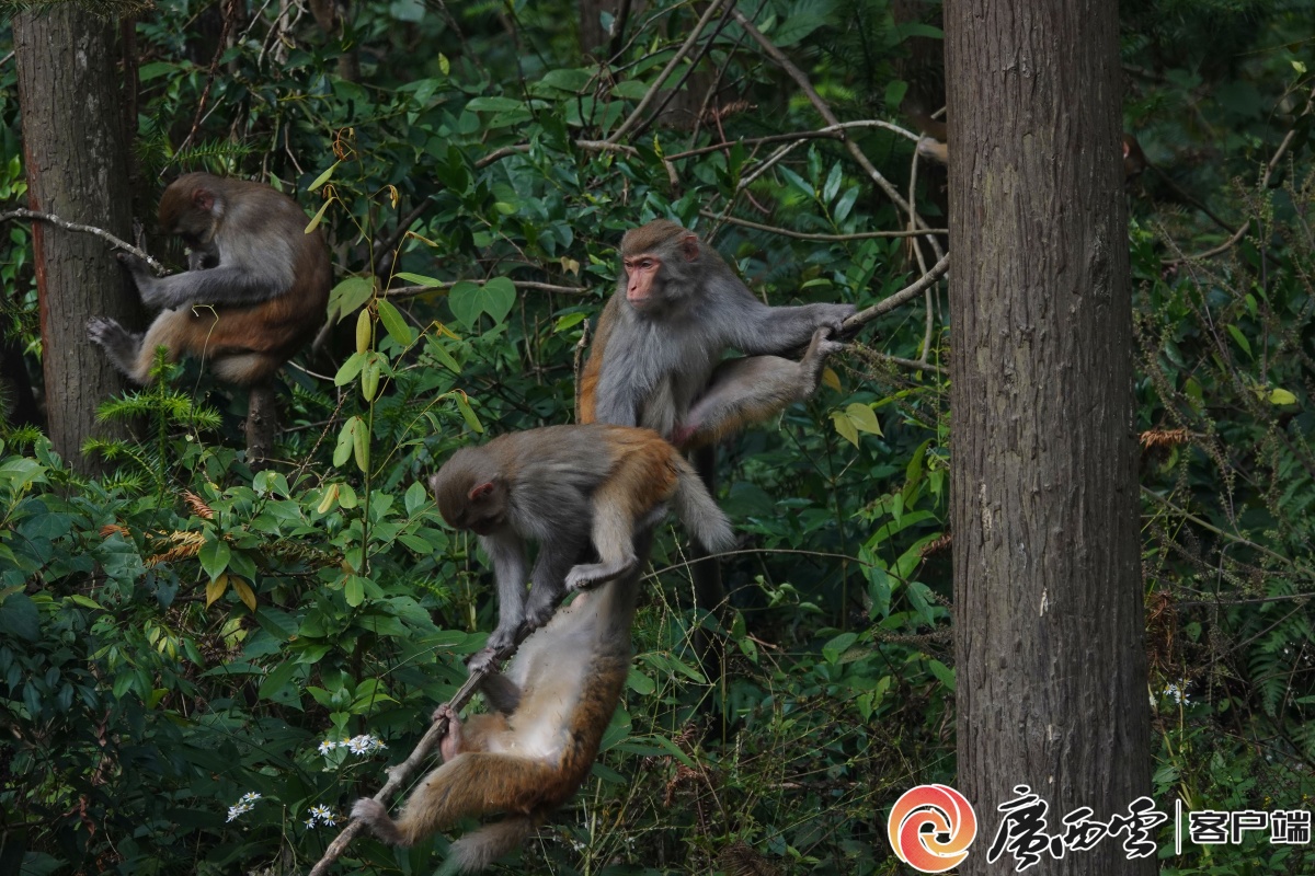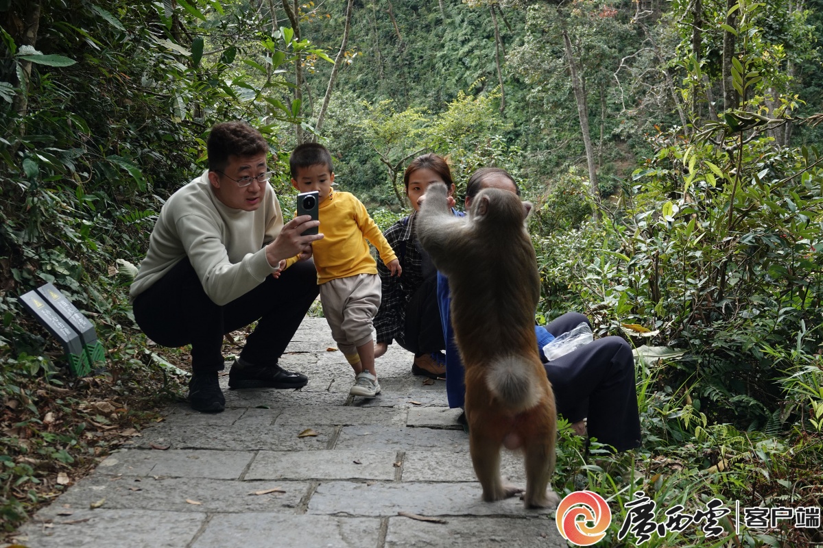 初冬时节,在贺州市姑婆山国家级森林公园内,一群野生猕猴或攀枝跃树,追逐嬉戏,或蹲坐石上,捧食细嚼,萌态十足,引得众多游人前来观赏。