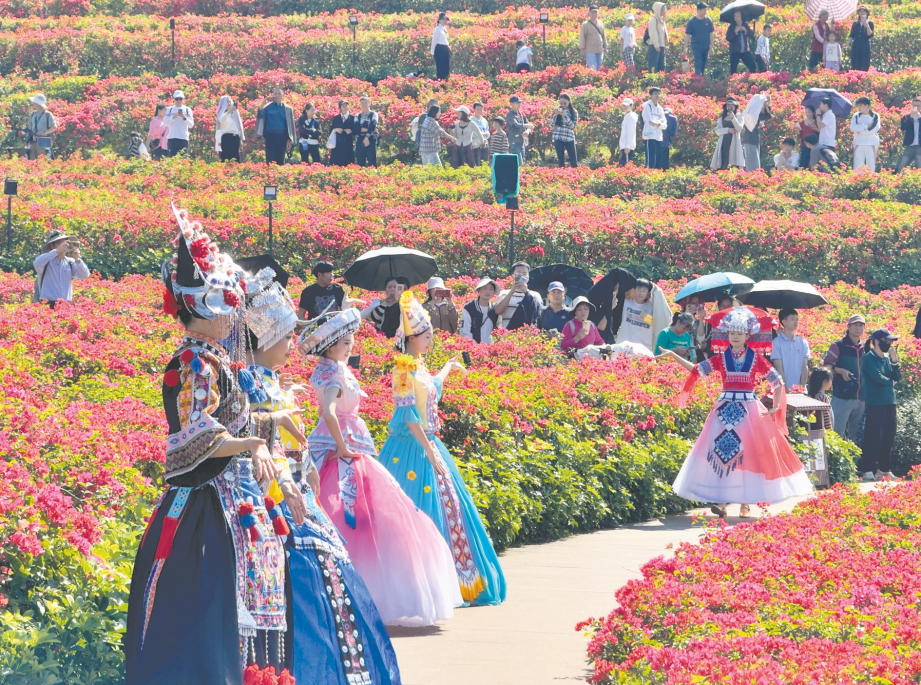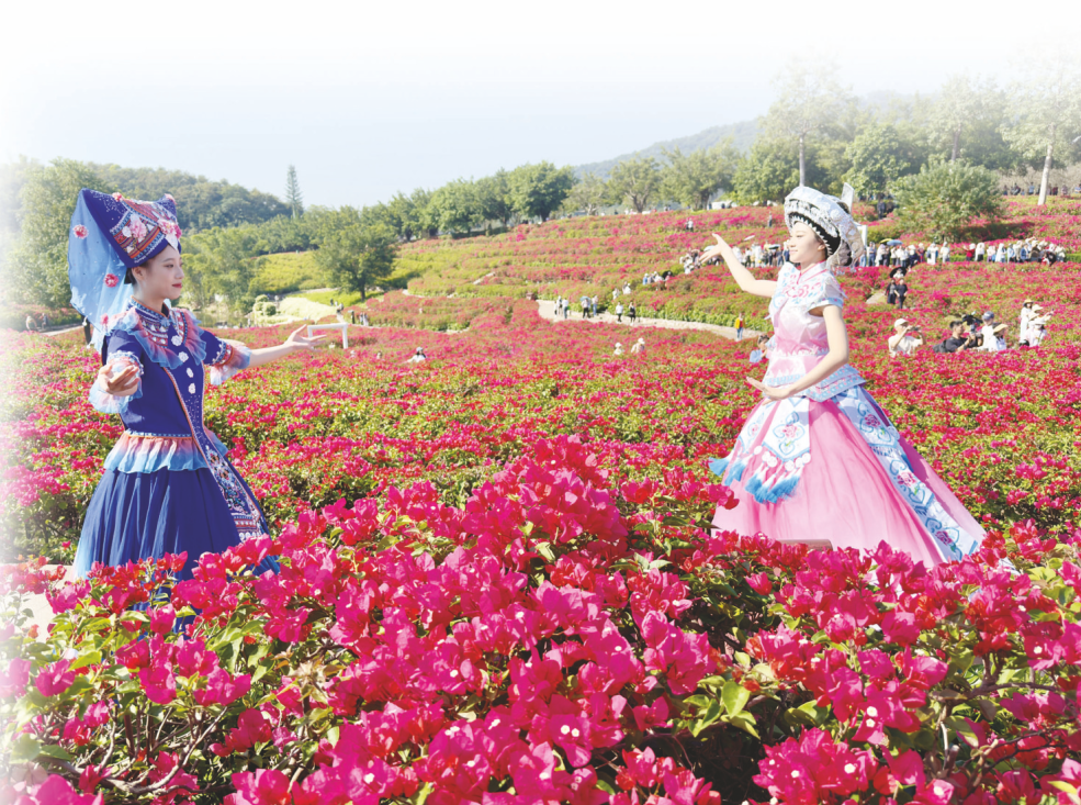 南宁青秀山风景区叶子花园里,定期上演的民族服饰秀为赏花活动增添亮点。记者 潘浩 摄 看,美丽的女孩穿着民族服饰沿花径巡游,裙摆与花瓣共舞;水波伴着琵琶声泛起涟漪,民乐与西洋乐隔空对话;花涧舞蹈、乐队Live轮番炸场,还有花仙子和小丑气球秀带给游客快乐。 “阳光灿烂,繁花似锦,处处是美景。”来自哈尔滨的游客陈女士感叹道,11月的南宁仍是花红柳绿,还可以欣赏到这么美的花。舞者们翩翩起舞,每一个轻盈的转身都与摇曳的花影相和,勾勒出一幅充满诗意的浪漫画卷。