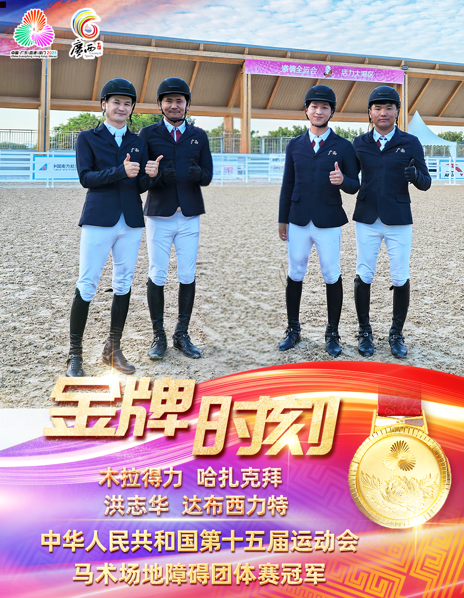 图源自治区体育局 11月17日,在刚刚结束的第十五届全国运动会马术场地障碍团体赛中,广西运动员木拉得力、哈扎克拜、洪志华、达布西力特在激烈的角逐中通力协作、发挥出色、勇夺冠军。这是广西运动员在全运会历史上的首枚马术金牌! |