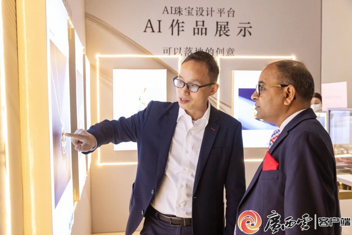 黄金珠宝首饰展陈。平桂区新兴产业发展中心供图 “我们此次的中国之行,主要目的是加强与中国制造商之间的合作,并参加一个重要的行业展会。在参与这次展会期间我们有了核心发现,就是人工智能在黄金珠宝设计领域的突破应用。”广西富龙珠宝有限公司合作外商哈米德·阿尔—赫卜希由衷赞叹道,现场看到AI技术显著简化了3D模型制作流程,这将大幅减少人工投入、缩短开发周期,从而有效降低制造业务的生产成本。